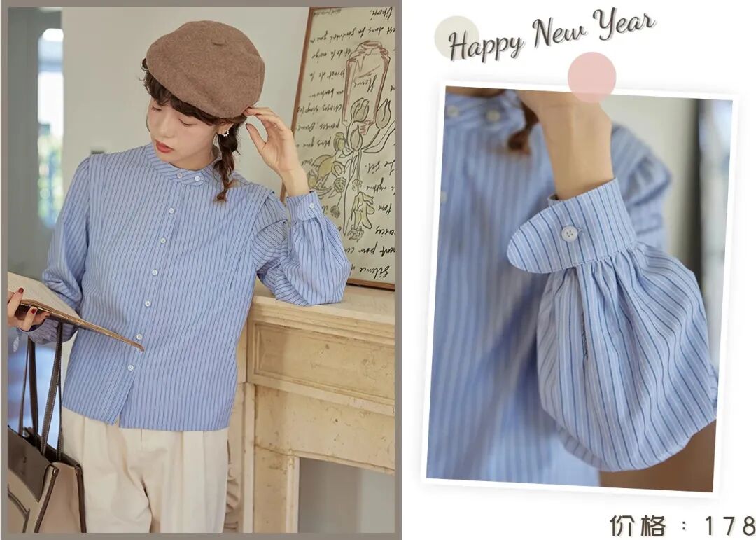 第一组的两套Look温柔又减龄,蓝色系穿搭看起来就很清新,好适合春天!竖条纹衬衫就非常不错,小圆领设计经典百搭,袖口的设计也很细节!