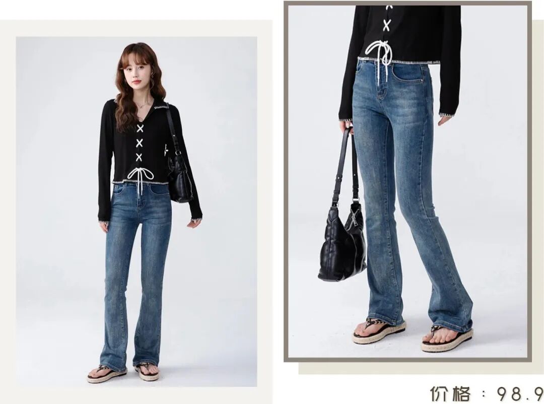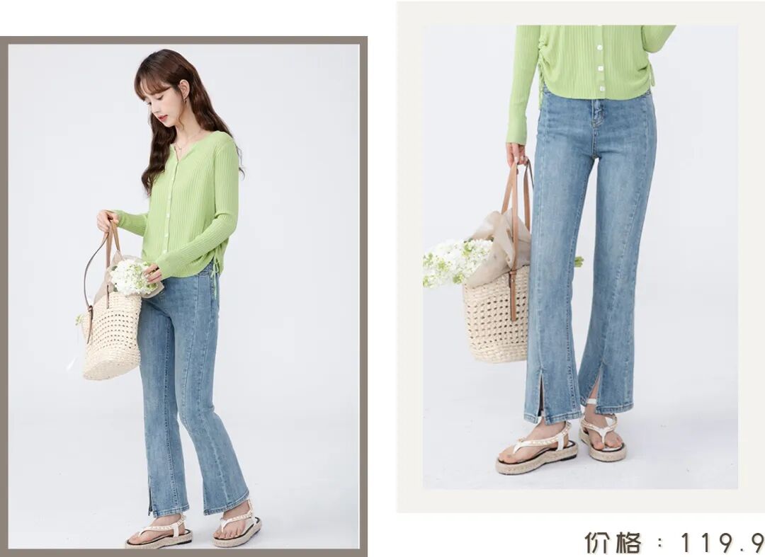 针织衫的下面,可以搭配长一点的喇叭裤,可盐可甜!上紧下宽的设计,视觉上特别显瘦,非常适合小腿有肌肉的女生。