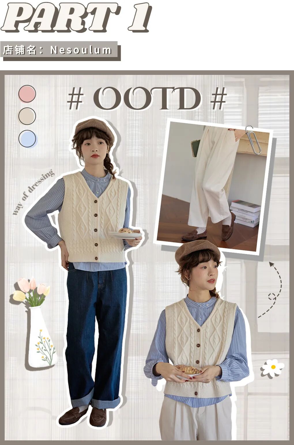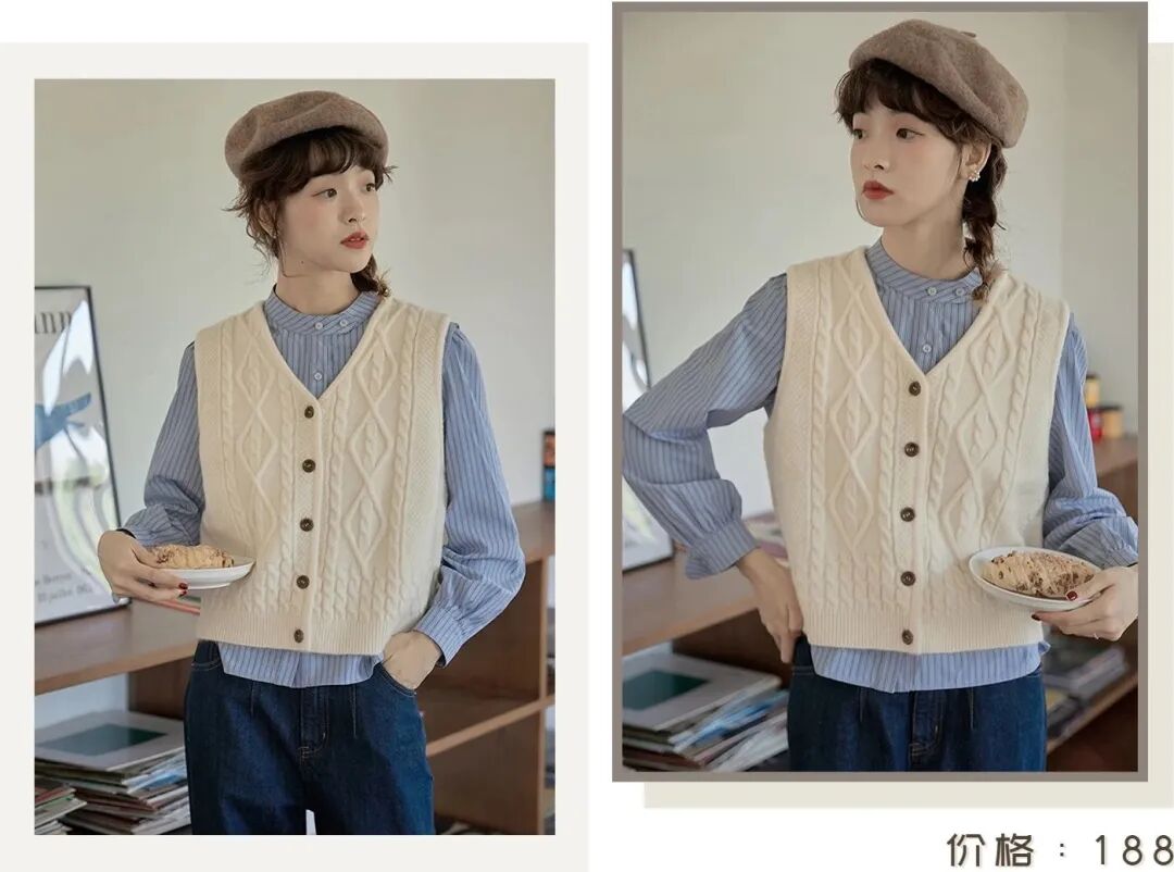 衬衫的外面还可以叠穿一件米白色针织马甲,麻花纹菱格增加了衣服的立体感,小v领设计很好地修饰了脖颈的线条,显瘦满分~