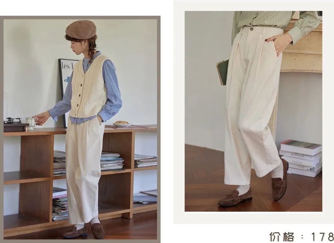 也可以把牛仔裤换浅色的裤子,比如这件可配性很强的奶白色直筒裤,宽松的大腿围,对身材的包容性很好,温柔的气质属实拿捏了~