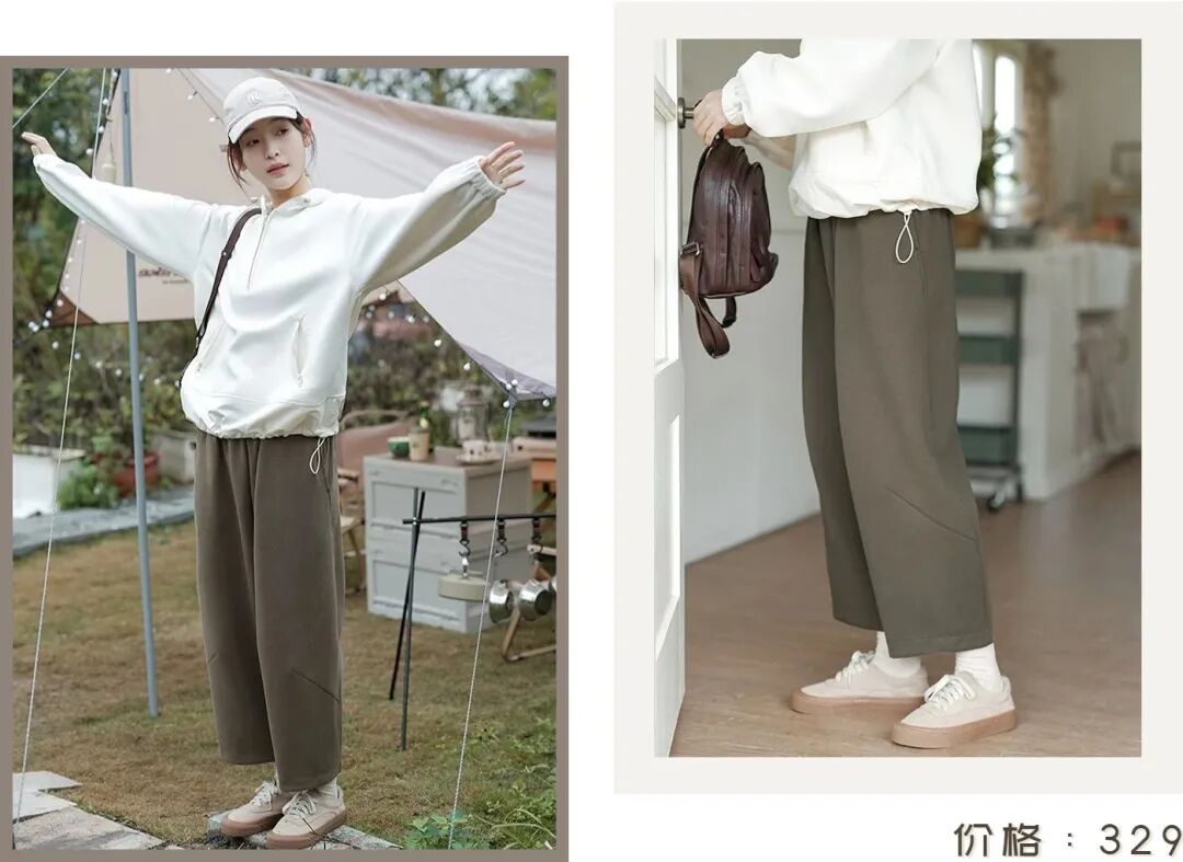 下装搭配一条米白色休闲裤,直筒的版型很好地削弱了裤子的臃肿感,裤脚处的松紧设计,利落不拖沓,简约低调、实穿性非常高!
