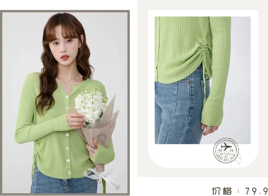 这件V领针织开衫也非常推荐,牛油果绿显白不挑皮,满满的春日气息,清新又治愈,非常吸睛,身材纤瘦的姐妹千万不要错过它~