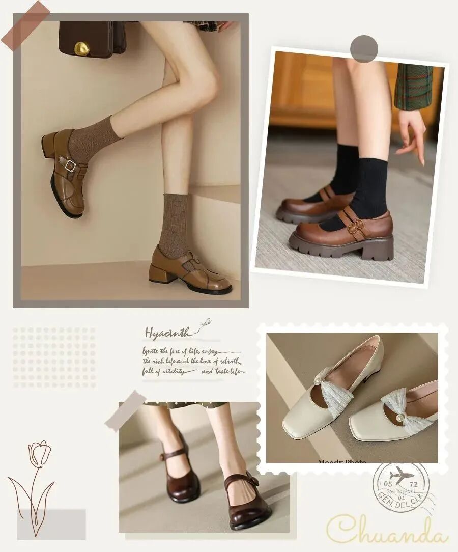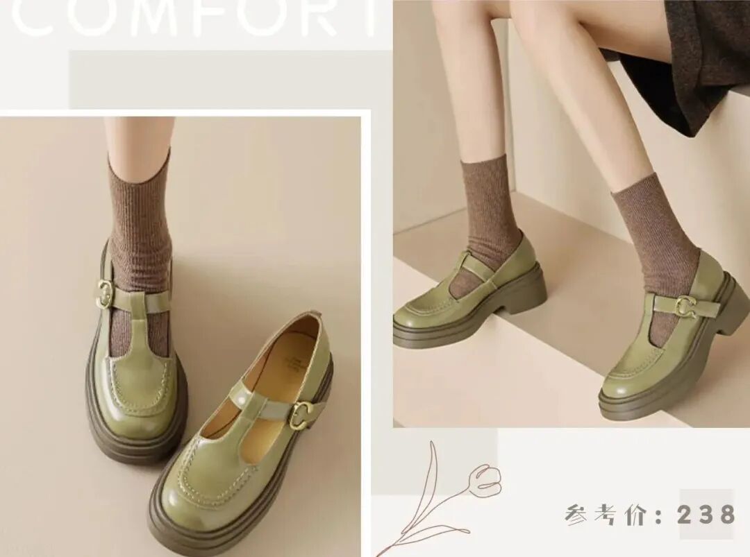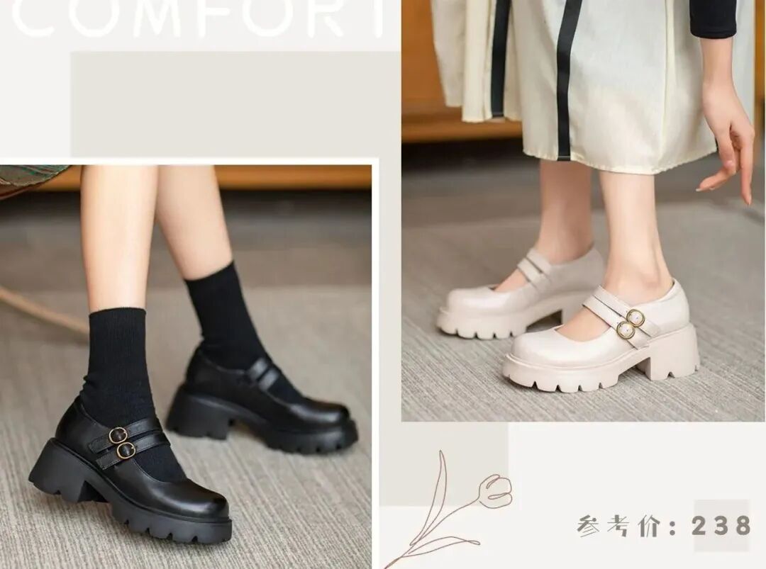 相比圆头玛丽珍,方头设计会更加复古,对脚型的包容度也更好,百搭不挑人,厚底设计很加分,显高显腿细,小个子星人最爱!