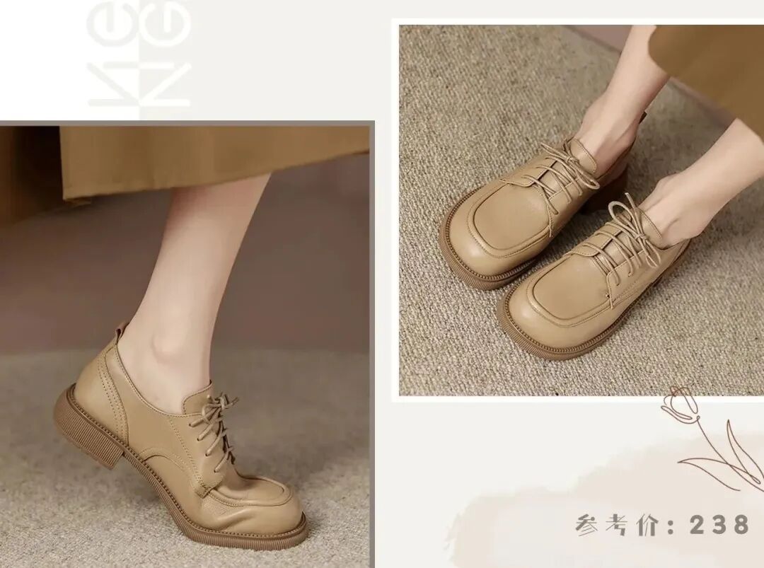 穿不惯高跟,那就换一双厚底的系带小皮鞋,这双棕色的工装鞋就很不错,圆头设计+做旧的质感,把复古值一整个拉满,又飒又干练!