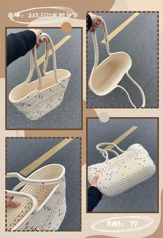 棉线材质编织,摸起来软软的,但即使什么都不装也很有型~恰到好处的色彩点缀又不会让包包看起来单调。这款我真的无敌种草!