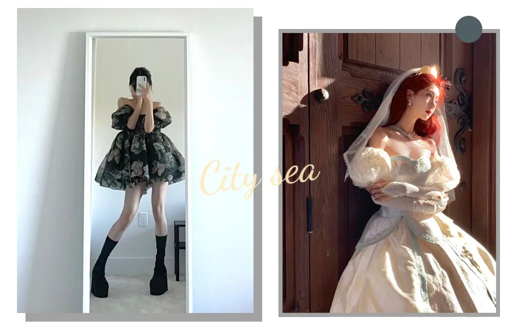 一字肩的蓬蓬裙也是公主范十足,如果再搭配一些小道具,比如头纱、皇冠之类的,拍出来的照片会更有氛围感!