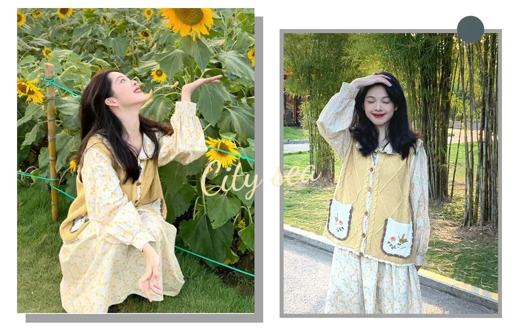 怕冷的姐妹可以选择这种长袖长裙打底,搭配一件淡黄色马甲,干净又乖巧。