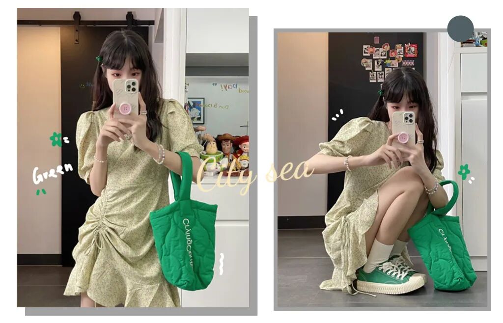 绿色的碎花裙也超有春天的气息好吗!褶皱设计还很藏肉,显白显瘦必备!