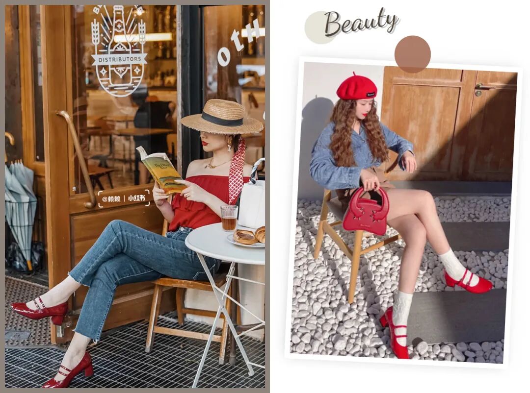 红色玛丽珍可以说复古风的标配了,尽显法式的优雅感,红色玛丽珍+蓝色牛仔单品的组合好绝,精致又吸睛,慵懒的氛围感一整个拉满!