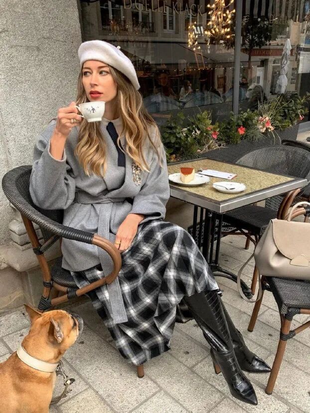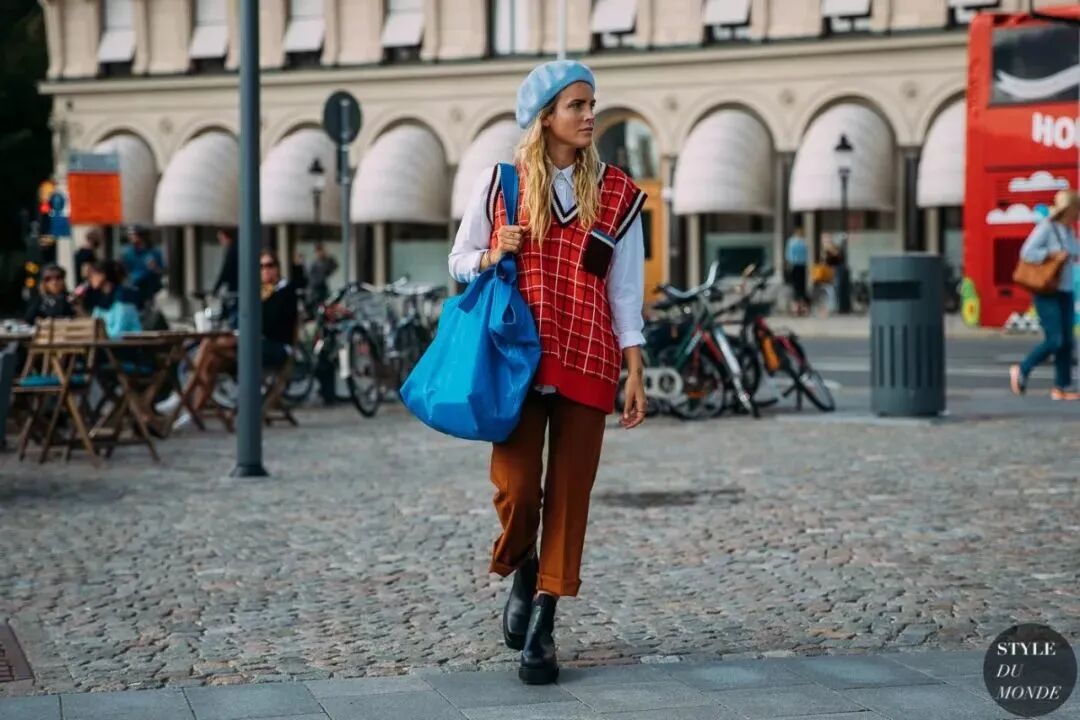 选择格纹针织马甲+阔腿裤,再戴上一顶贝雷帽,复古又文艺,英伦范儿十足~