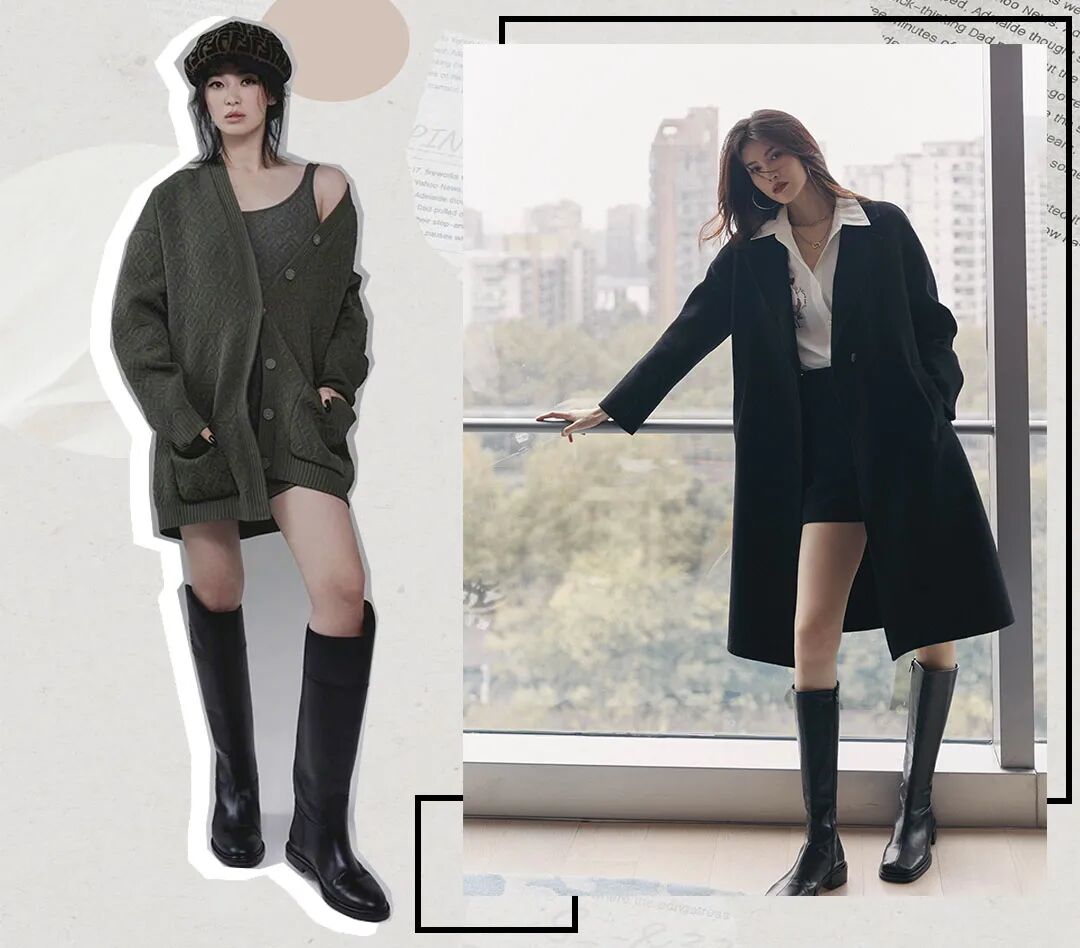 如果是腿不直的姐妹上述的长度是完全行不通的,甚至可能适得其反放大缺点。这时候我们就可以选择过膝靴,能很好地遮盖腿不直的问题。