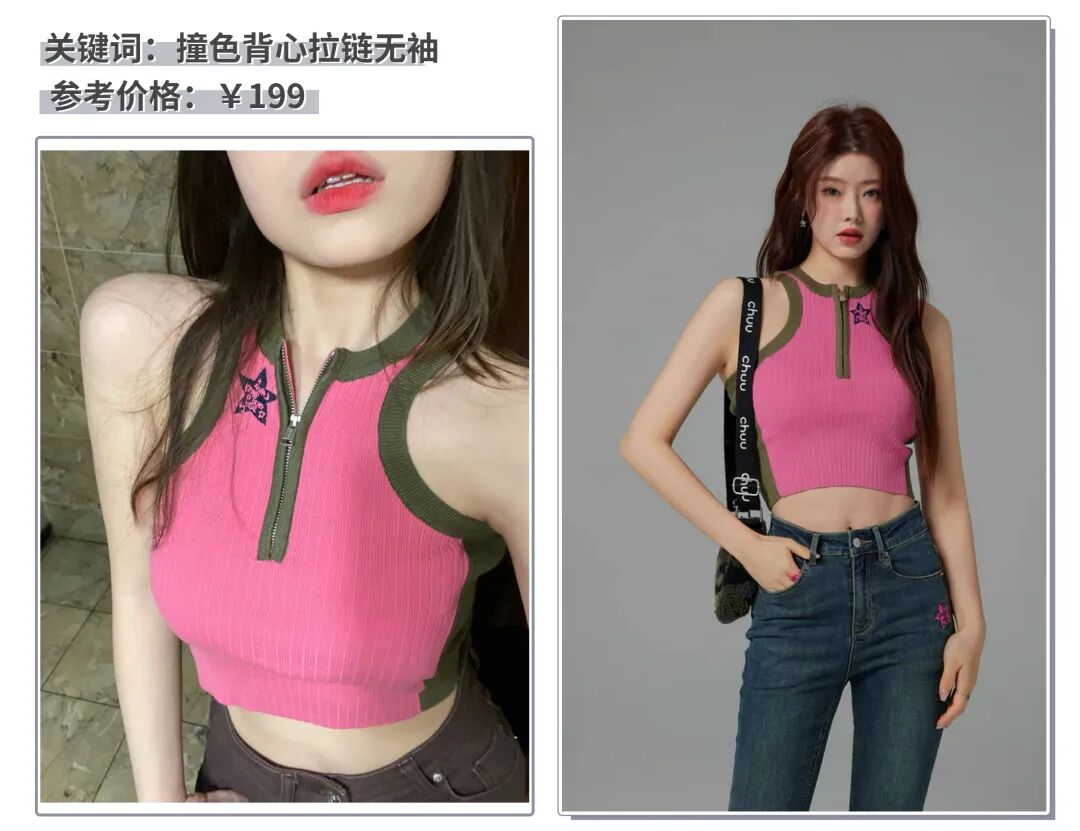 讲道理夏天一定要拥有一件玫红色的背心,显白又亮眼,这件跟普通的背心不同的是,领口有拉链设计,可以更好地展现修长的脖子。