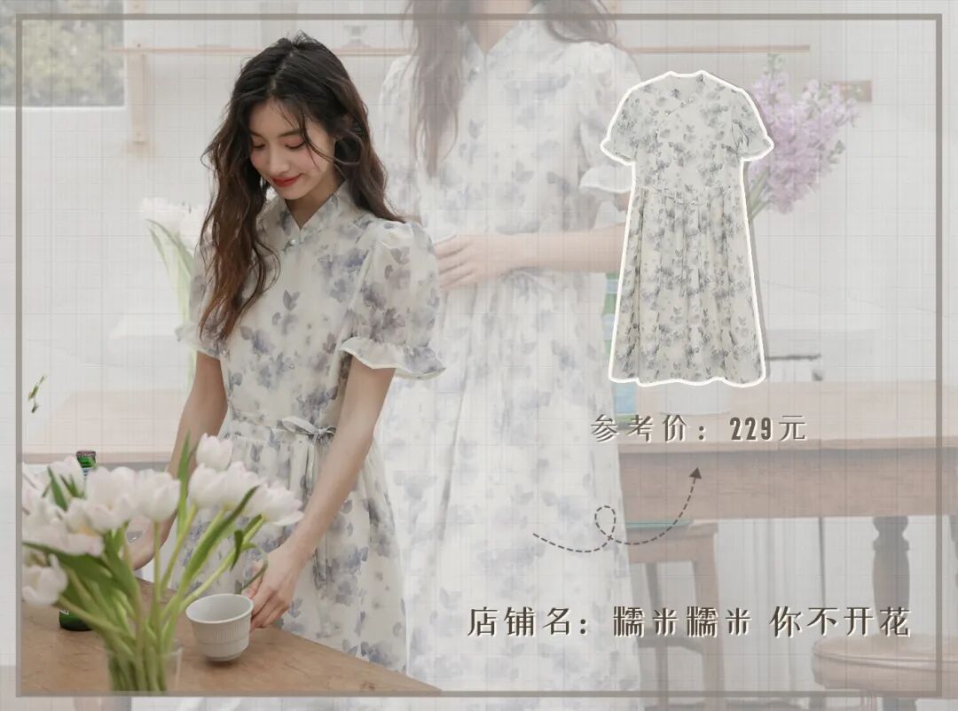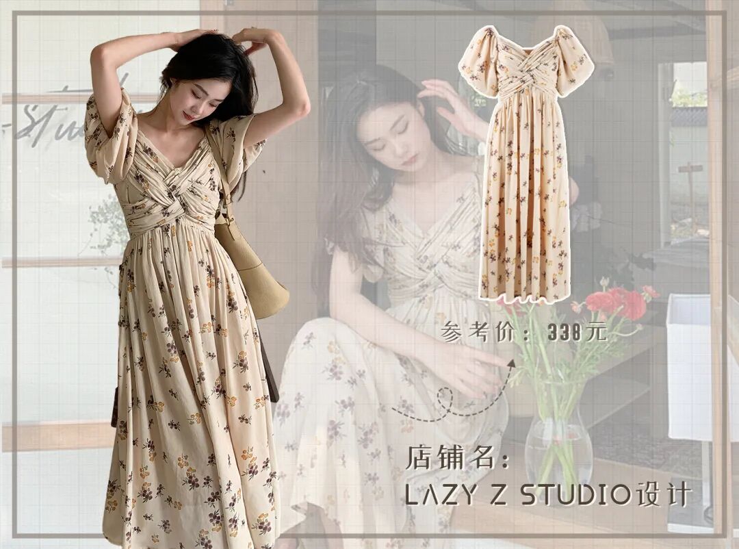 最后再来一件非常气质的缩褶连衣裙吧,淡雅的杏色底布温婉又美好,恰到好处的露肤率,不仅可以修饰颈部线条,还能显脸小,浪漫的法式优雅感一整个拉满~