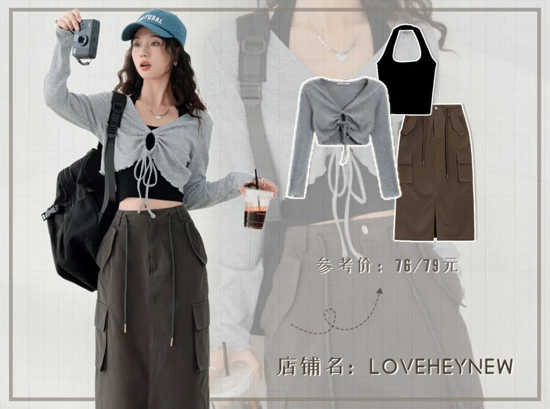 挂脖背心+长袖外衫的组合也是辣妹穿搭的优秀范本,尤其是外衫中间的圆圈绑带设计,性感又时髦,再搭个高腰的半身裙,上身秒变大长腿,对小个子女生也很友好!