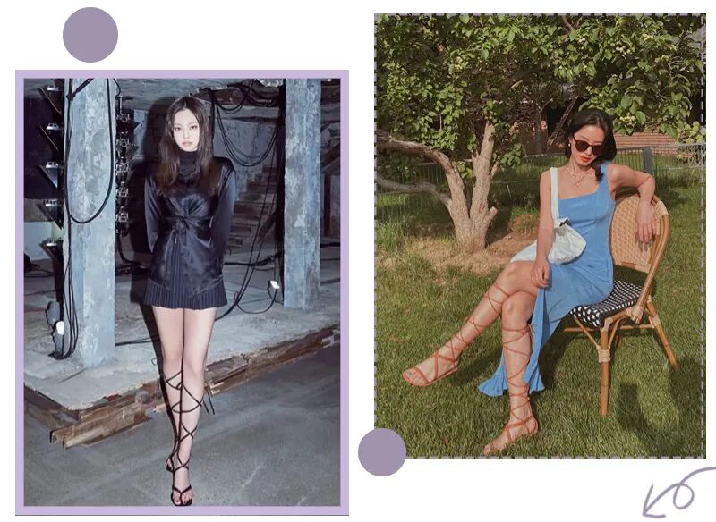 绑带凉鞋有种异域风情,自带小野性。它跟过膝靴有异曲同工之妙,不过对身材要求有点高,一不小心就会显腿短、腿粗...