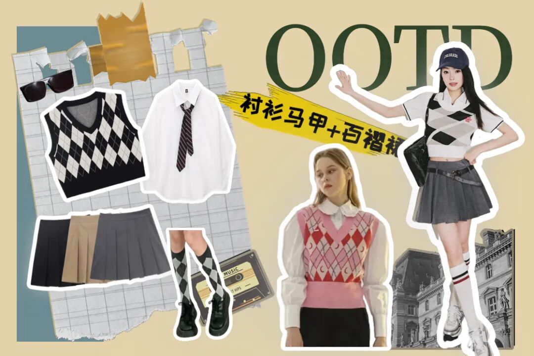 这套穿搭的精髓就在于一件修身的菱格马甲,复古美式的典型元素,可以在许多穿搭博主的look里见到。
