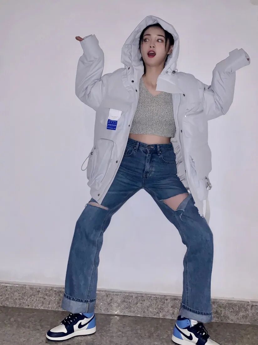 直筒裤也很好搭配,既然下身已经是宽松款,那上身就尽量挑选一些修身款来达到整体的和谐,也能展现好身材,外面套一件羽绒服就完事~