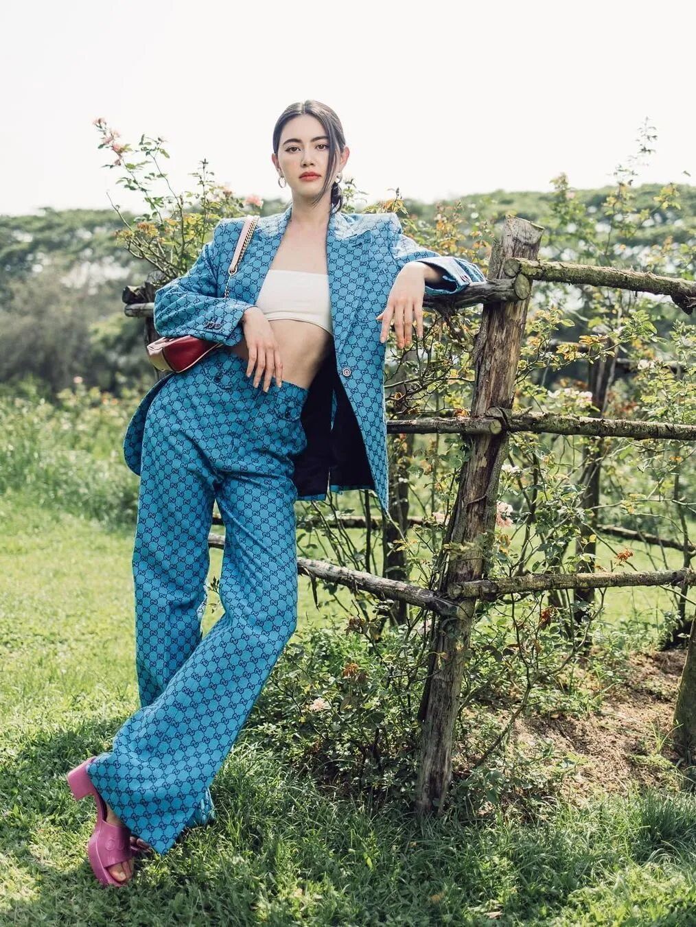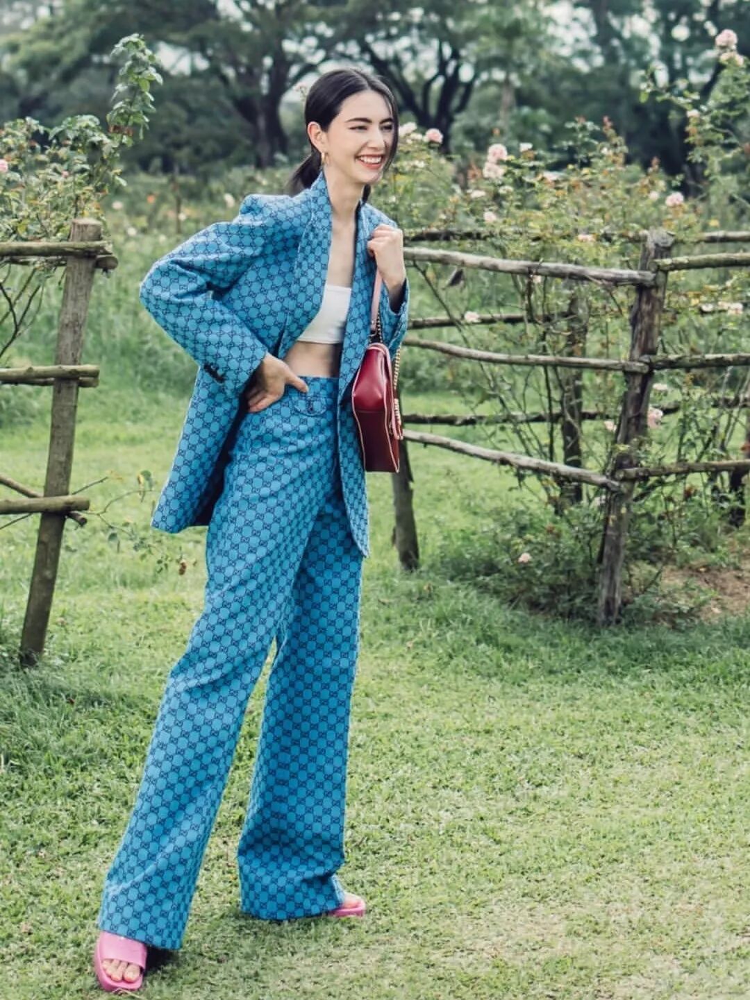 除了基础纯色西装裤,偶尔换一些老花亮色西装set也吸睛度MAX,为了避免眼花缭乱可以用一些白色来中和西装的花哨。