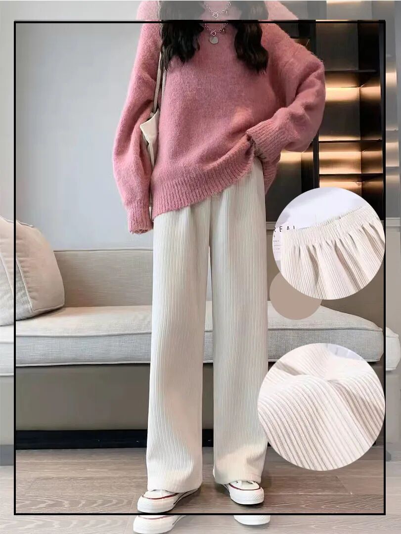 今年对雪尼尔面料的豆腐裤情有独钟,宽松软糯超适合冬天。有一些竖条纹且垂感很好,能自然地遮肉显瘦。