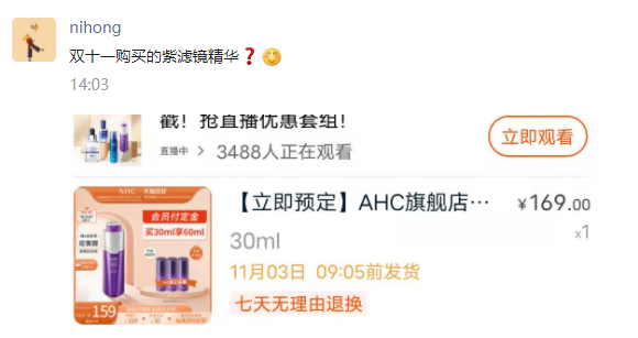 恭喜“nihong”宝贝抽中AHC紫滤镜精华一瓶👇