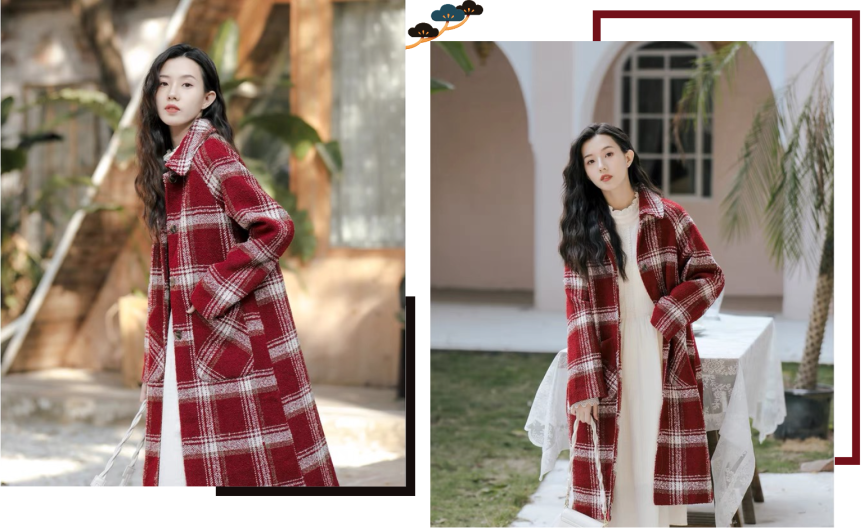 法式翻领+中式盘扣的中西结合,既洋气又融入了浓浓的国风韵味,甚至还有一丝减龄的气息!另一件H字版型,再用腰带提高腰线,气场直接一米八有木有!