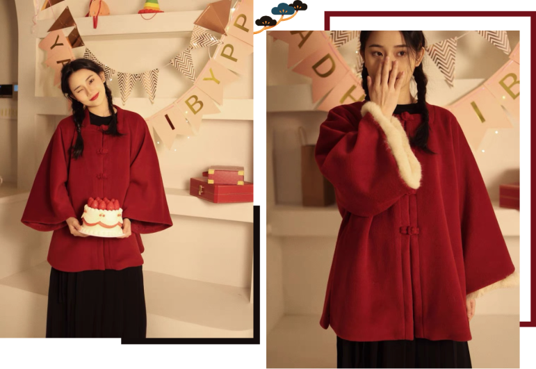 所以说到中国年,我更喜欢的是中国红和国风元素的结合。改良版的明制方领日常感十足,穿出门一点都不突兀,但是这种版型可能从侧面看会有点显壮。