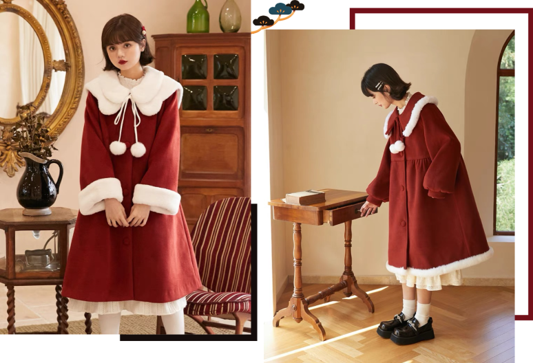 不得不说白色边边和毛球点缀的红色大衣就像童话故事中的少女,说是大衣,是不是更像暖暖的冬日小裙子!