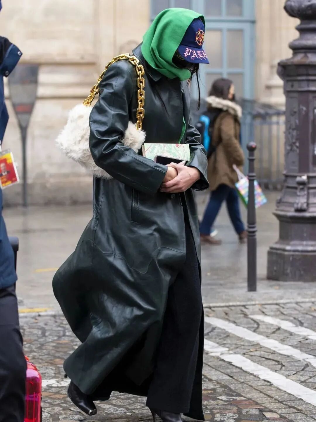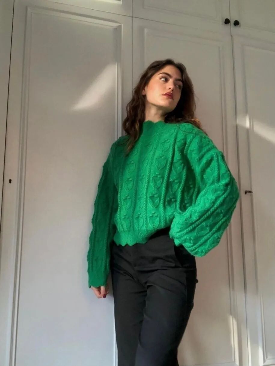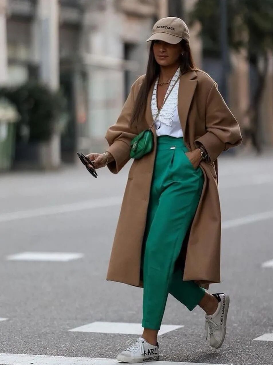如果觉得大面积的绿穿在身上过于显眼,做配饰点缀也是非常不错的idea,围巾、包包、帽子...只要稍加点缀就能给穿搭加分超多。