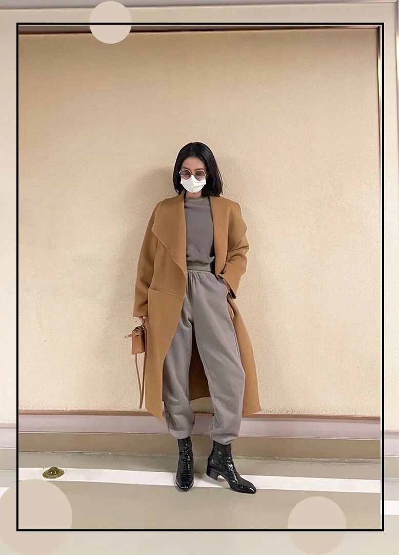 一身灰色运动装set外穿一件卡其棕大衣,休闲和正式结合的刚刚好~(运动装+长外套的搭配可以举一反三)