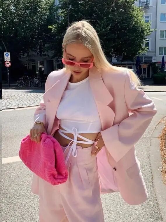 在往常,浅色系只作为辅助色出现。而今年流行的嫩粉红,因为加入了适量的珊瑚色就变成了柔和的暖色调,作为主色调也不会给人轻浮的感觉,还能很吸睛。