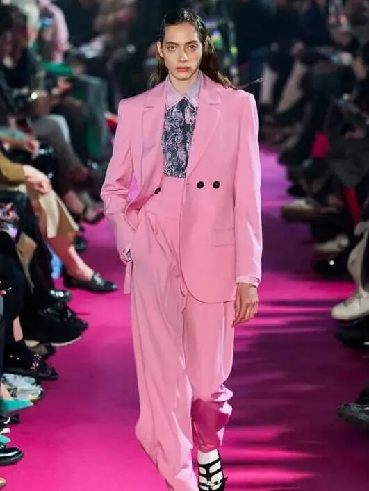 材质硬挺的面料非常需要嫩粉色来调和,本身严肃板正的面貌经过它的加入多了些女性的柔美,娘man平衡~