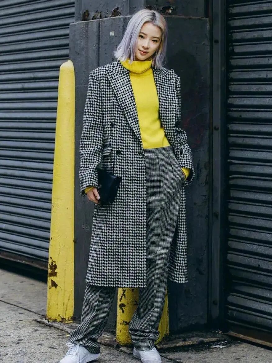 用明亮黄作为主色调应用在大衣或套装上,在早春穿搭中很是亮眼,担心跳脱就可以用黑白来压一压。