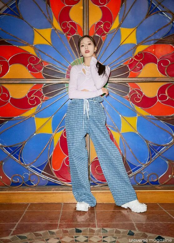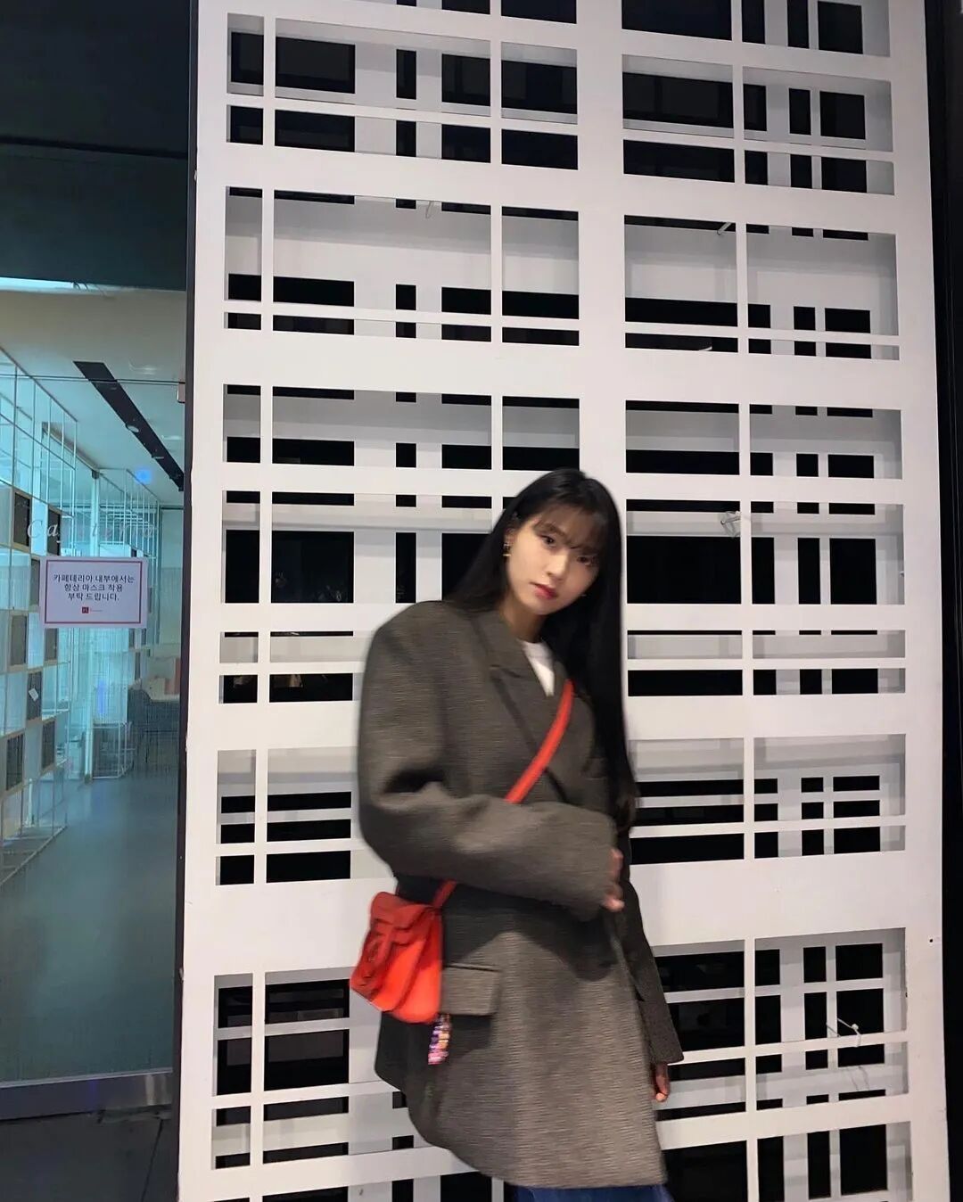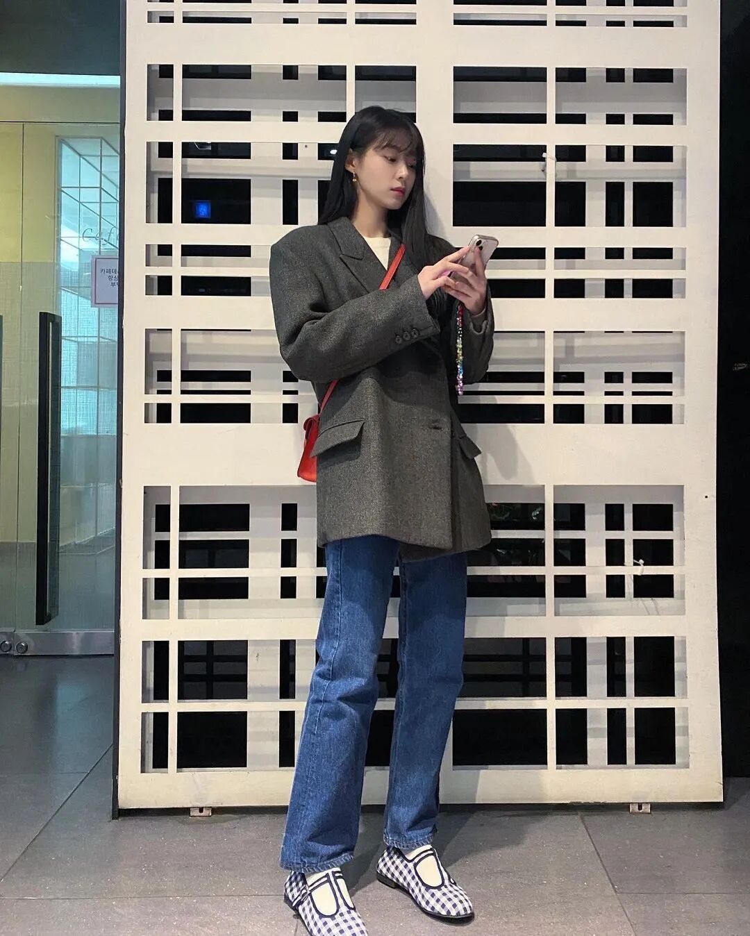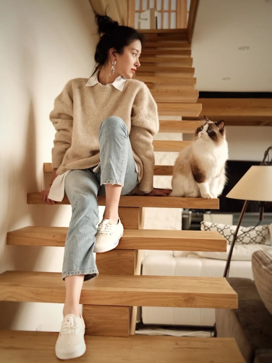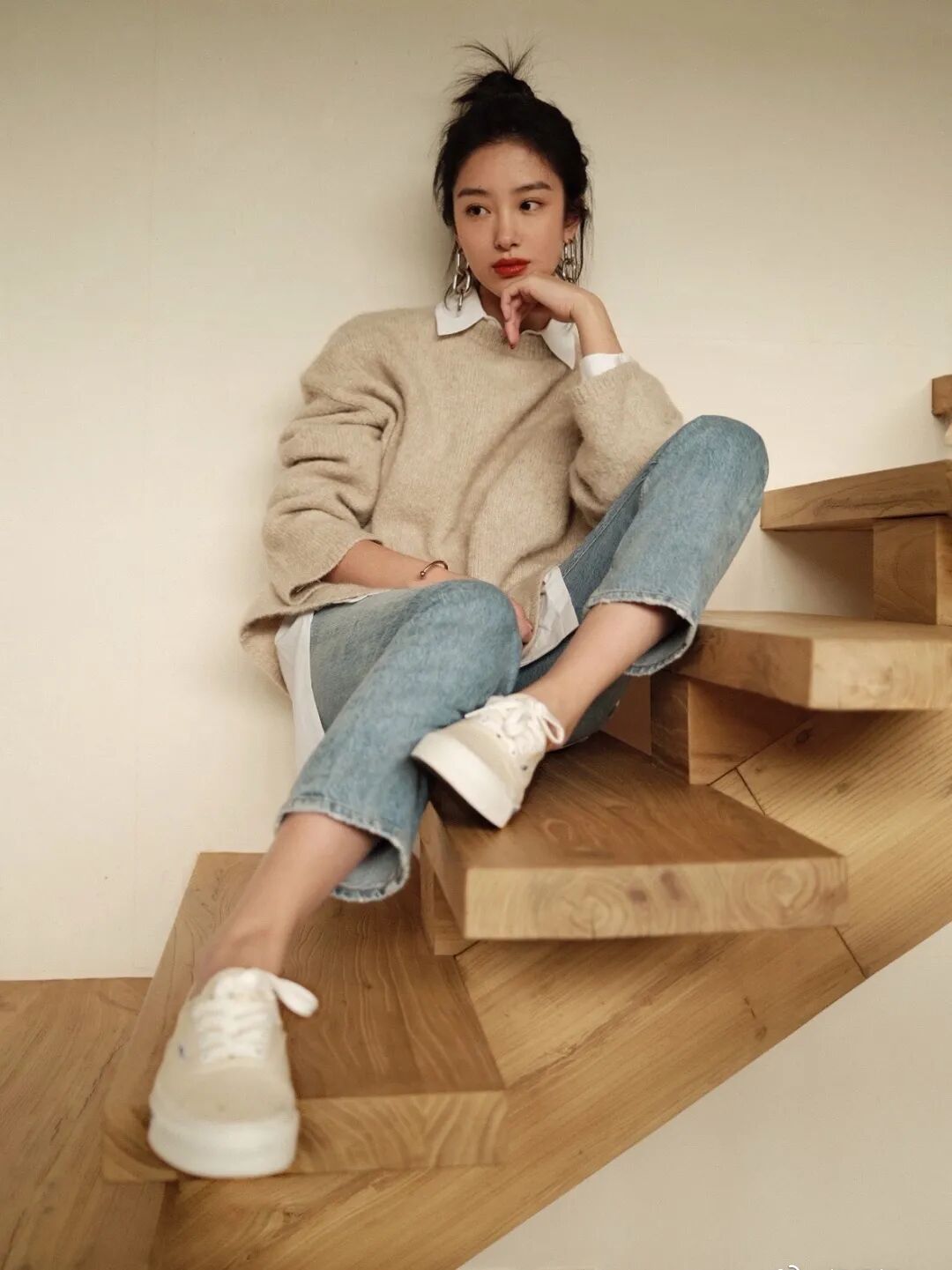 既然下身偏修身,上身就可以选择稍微宽松的款式。像杨采钰这样衬衫+毛衣叠穿温暖舒适却不失格调的休闲style,脚踩一双毛衣同色帆布鞋就很耐看。