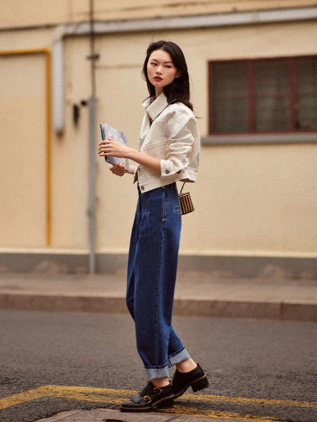阔腿牛仔裤也可以尝试all 丹宁的穿法,只不过内搭千万要选好,不然就有可能穿成车间工服。