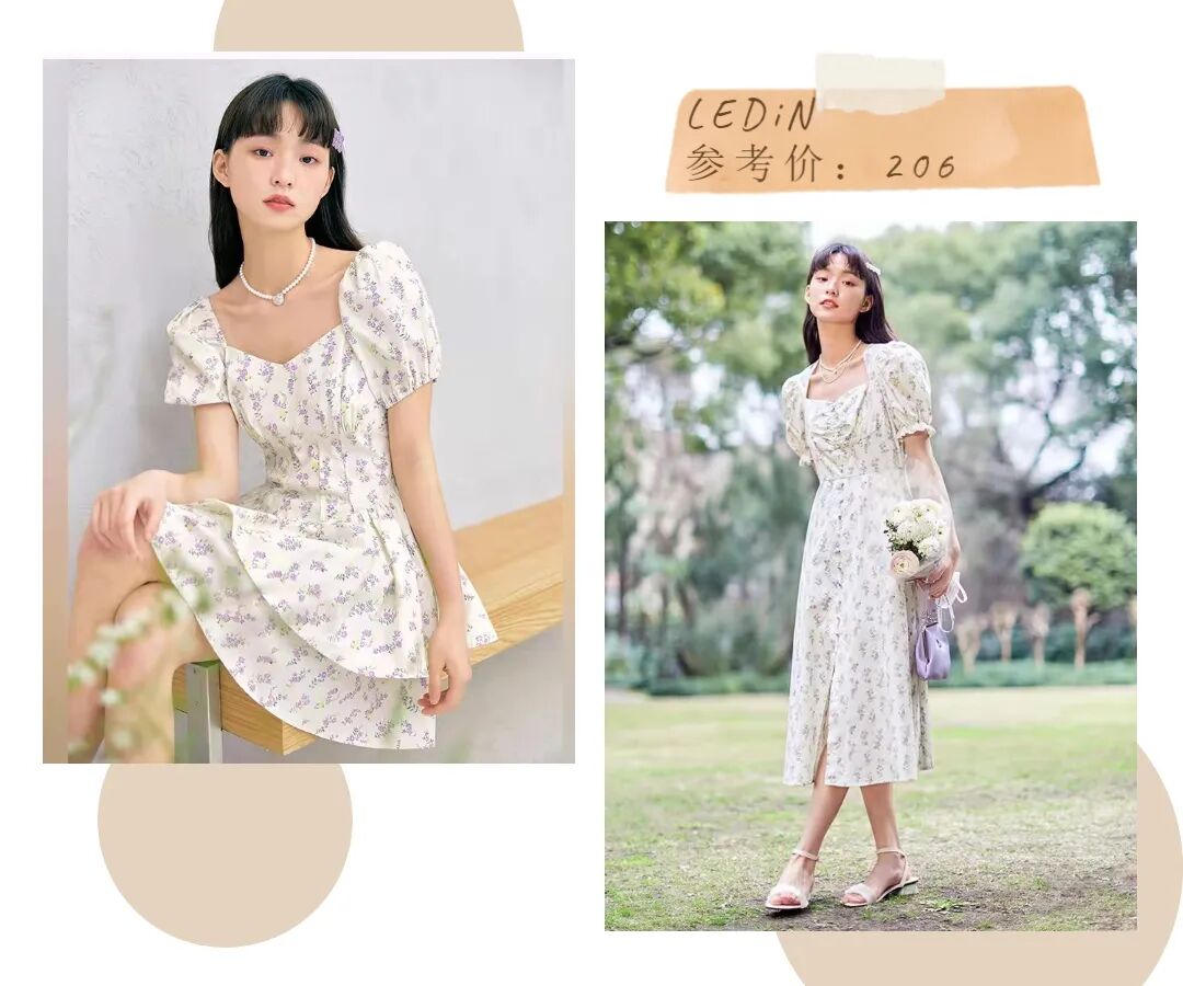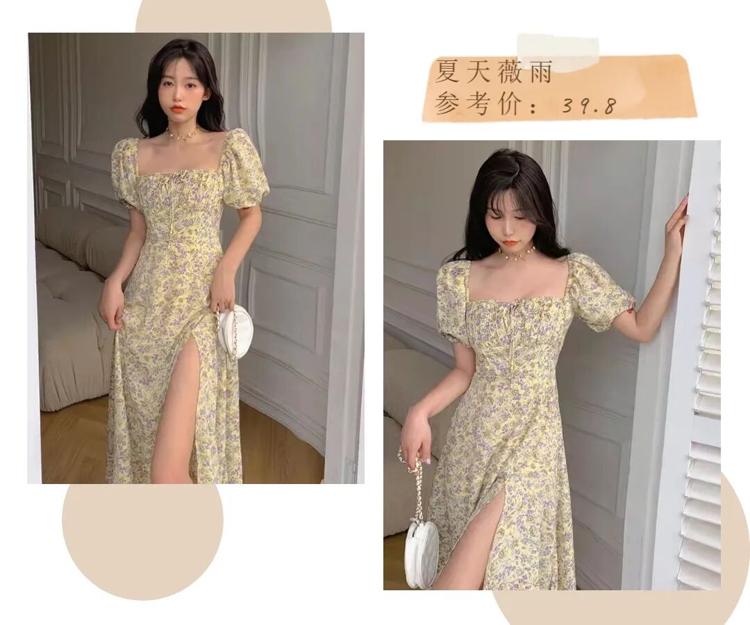 这款泡泡袖的碎花长裙也很好pick,大方领修饰脸型和肩颈线,下摆大开叉又多了些性感的魅力~(微胖的女生穿会更有感觉)