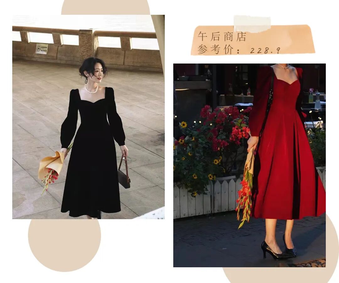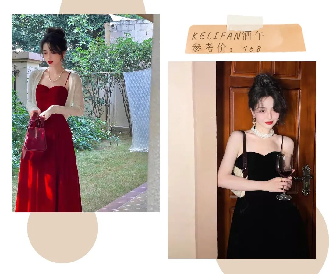 之前给你们推荐过的酒午家,这件丝绒裙是吊带的款式,锁骨好看的一定要冲!红色明艳黑色沉稳!