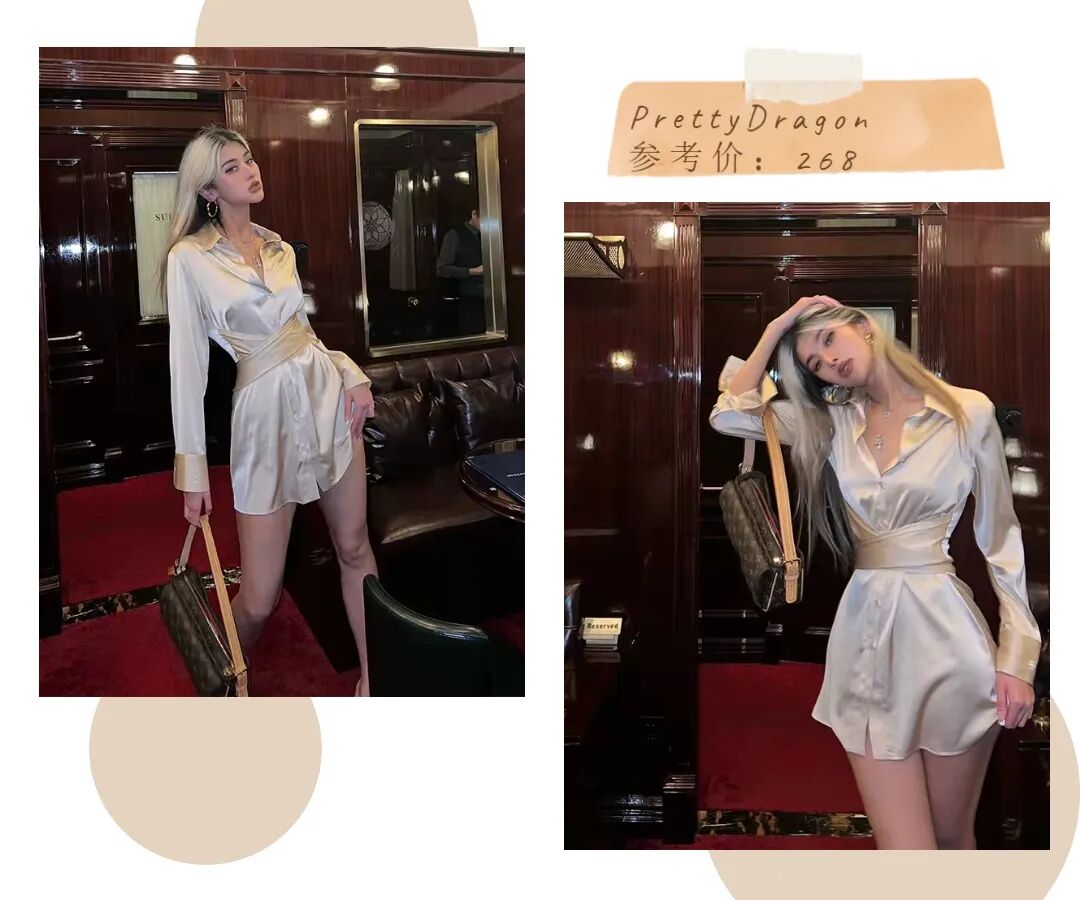 V领系扣款也是女人味十足的必入款,在腰部系带更能强调腰线的存在(纽扣款容易崩开会更加考验身材)。