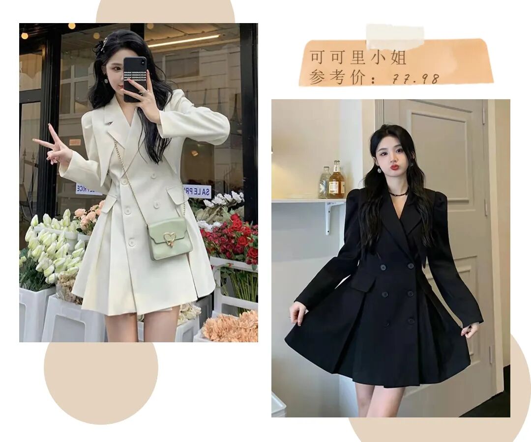 西装长裙就更有轻熟的味道,黑白拼接的款式加上A字版型既清冷又有气场,妥妥职场丽人~