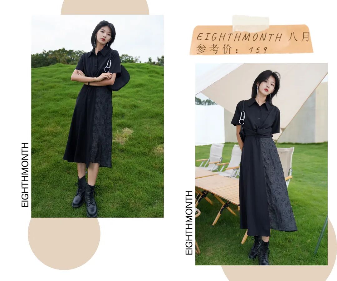 黑色则沉稳清冷,裙摆两种材质拼接给普通的设计提升了精致度。
