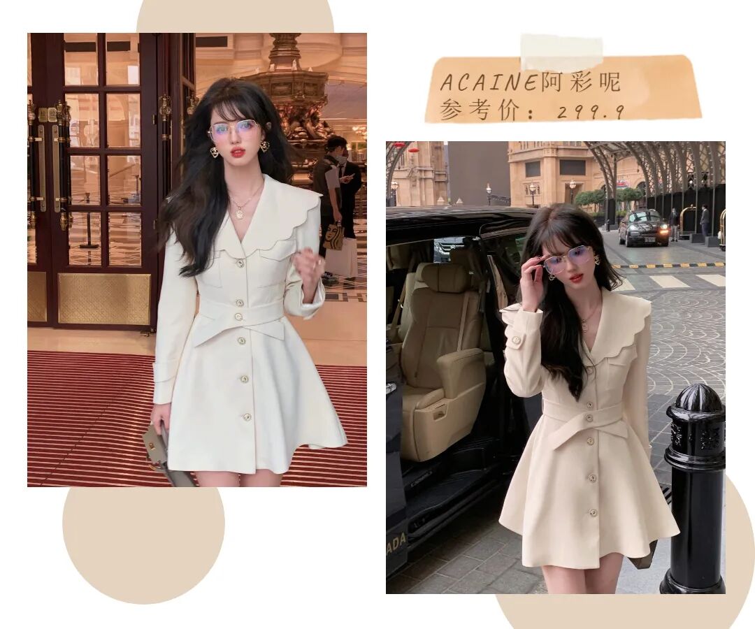 这件我很喜欢她领子和收腰的设计,下摆是带点褶皱的A字版型能有效显腿细腿长,扣子也很有质感。