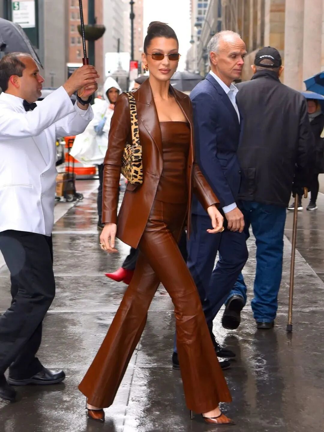 而适当皮质元素的出现也为Bella的美式复古穿搭增加了灵魂,大地色系的皮质单品光泽感很强,也更显气色。