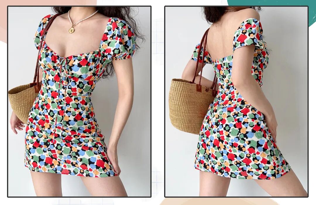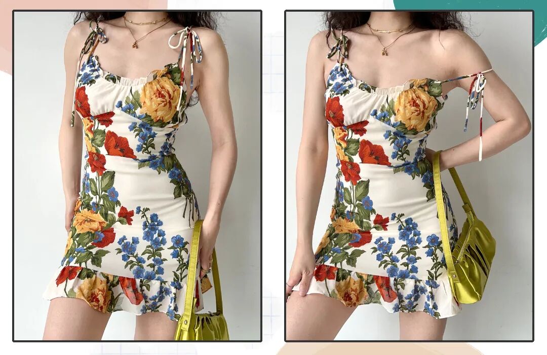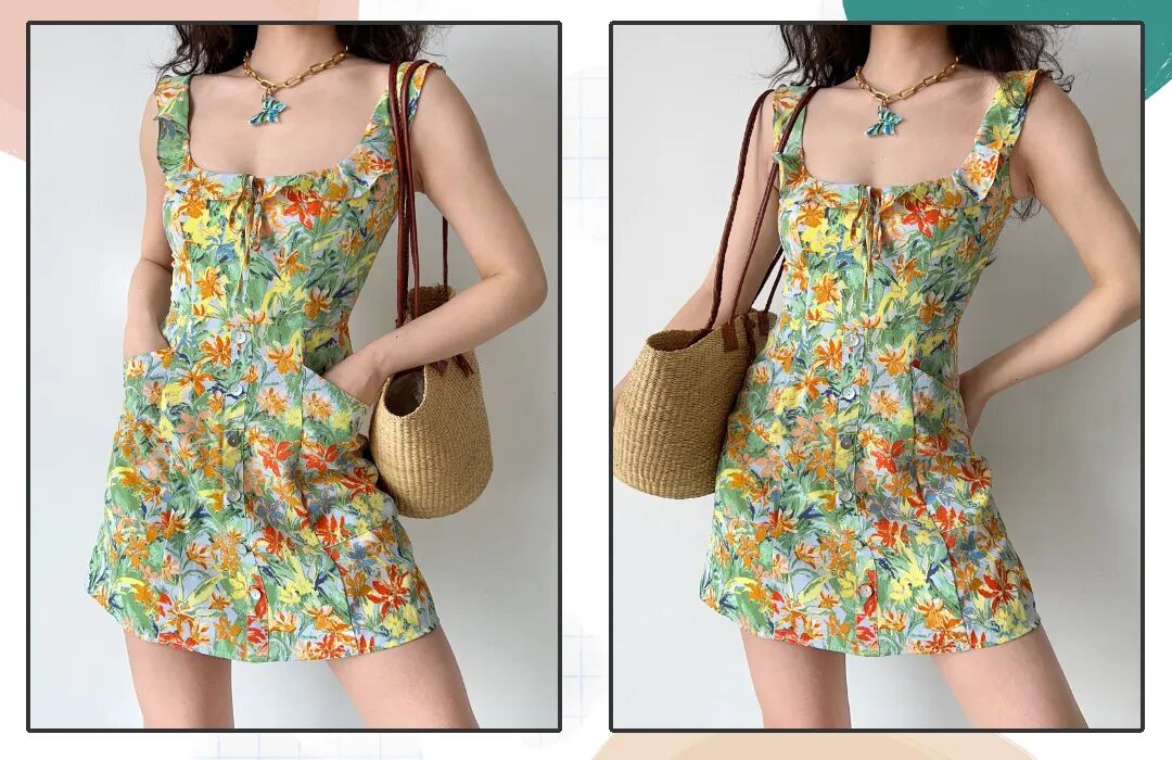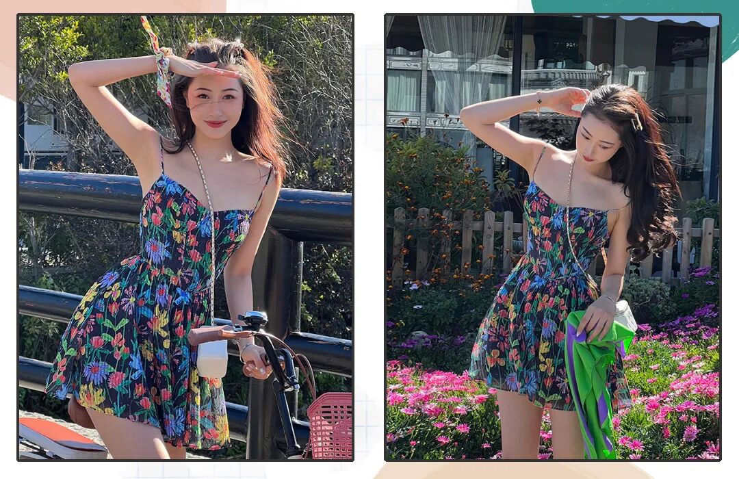 撞色油画印花给人眼前一亮的感觉,加上胸部和腰部的立体剪裁更有热辣的氛围~