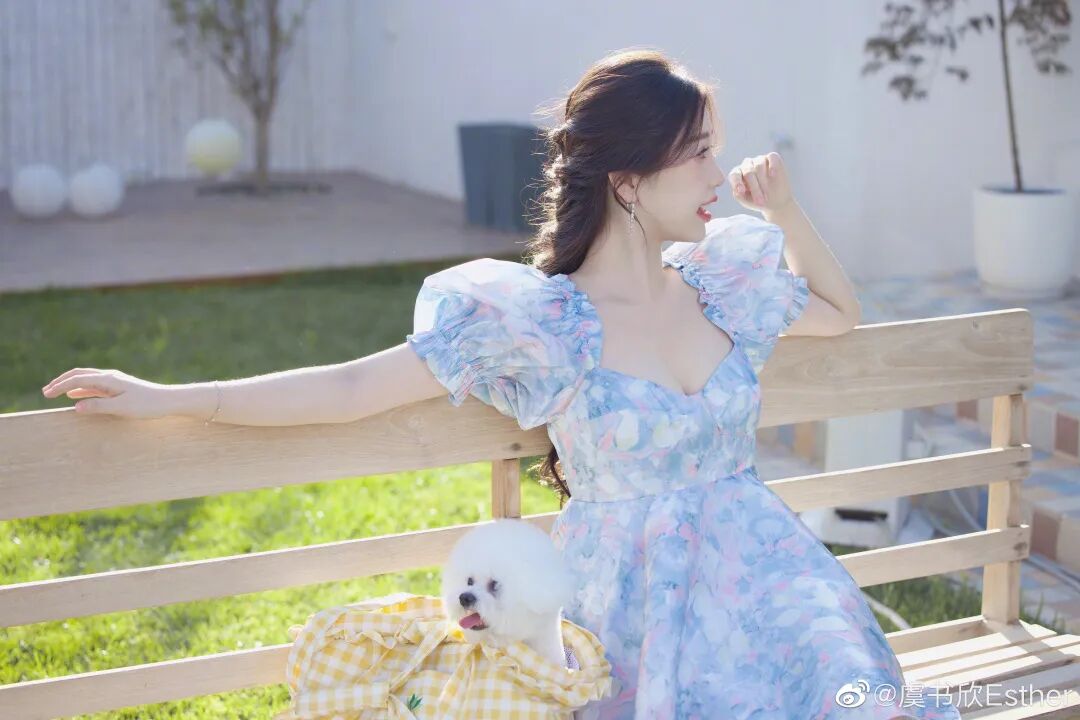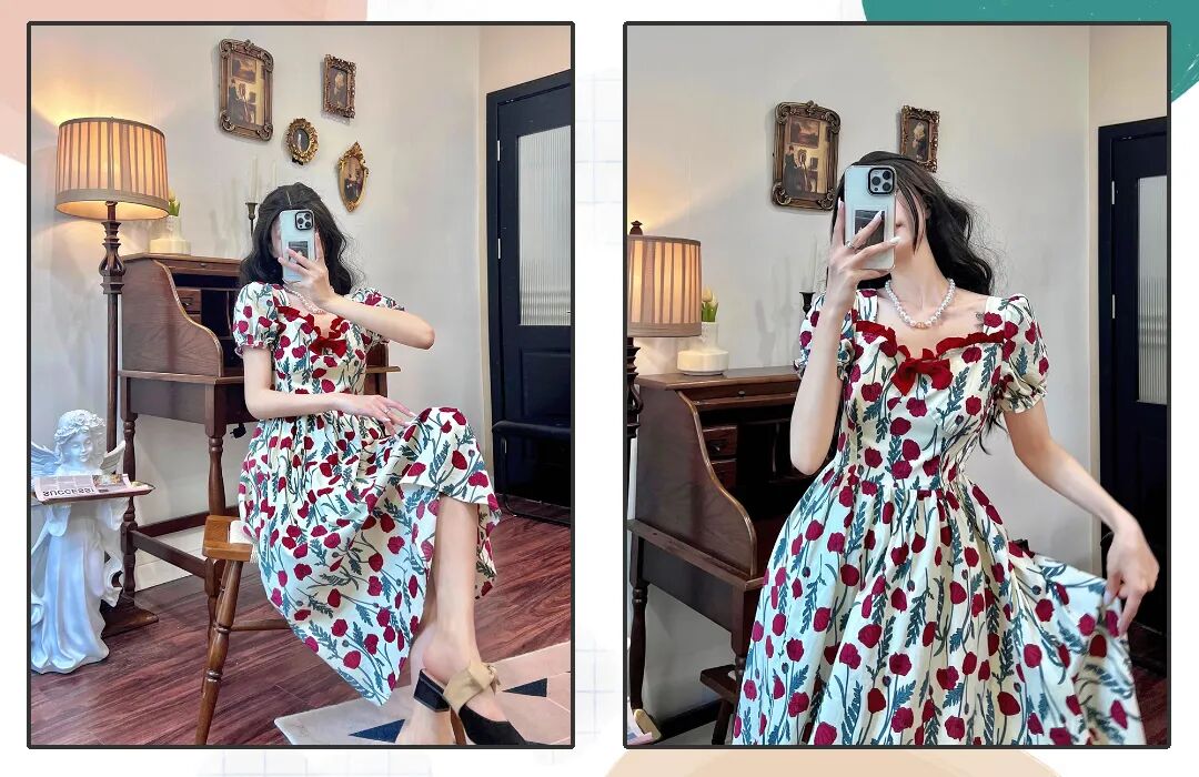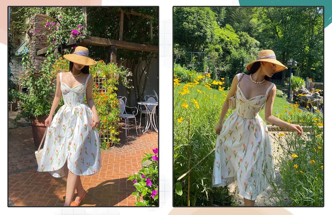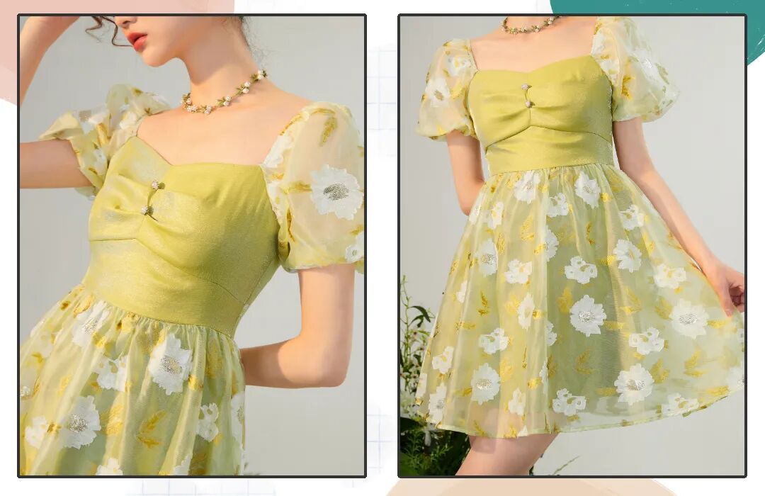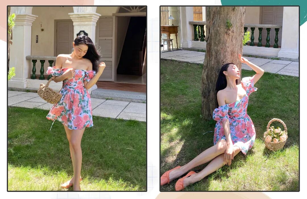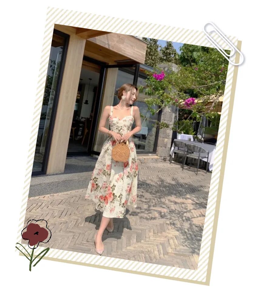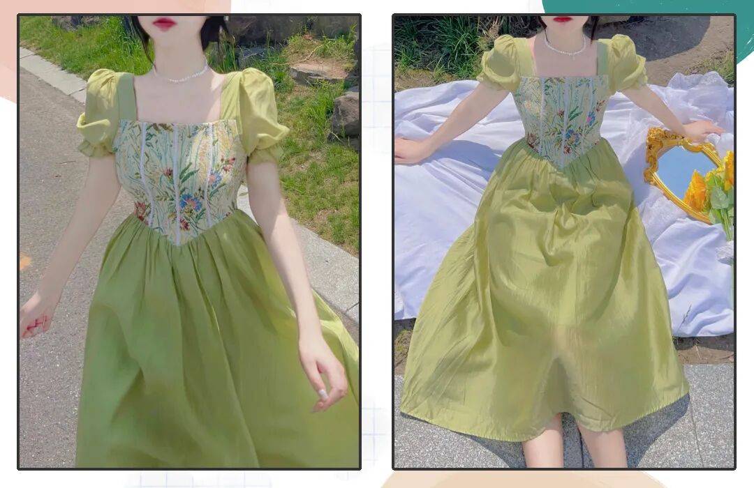 超有宫廷感的方领油画裙,因为只在上身做了油画设计整体更加干净清透,与夏天绿木融合画面感更高。