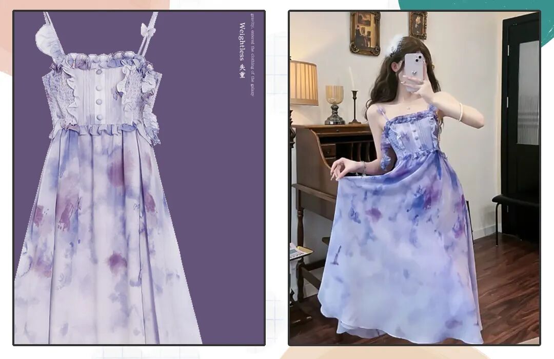 虽然紫色好看但能把油画裙和紫色融合的这么好还是非常难得的,这件吊带油画裙既有梦幻清冷的气质也有油画的明媚肆意的感觉。