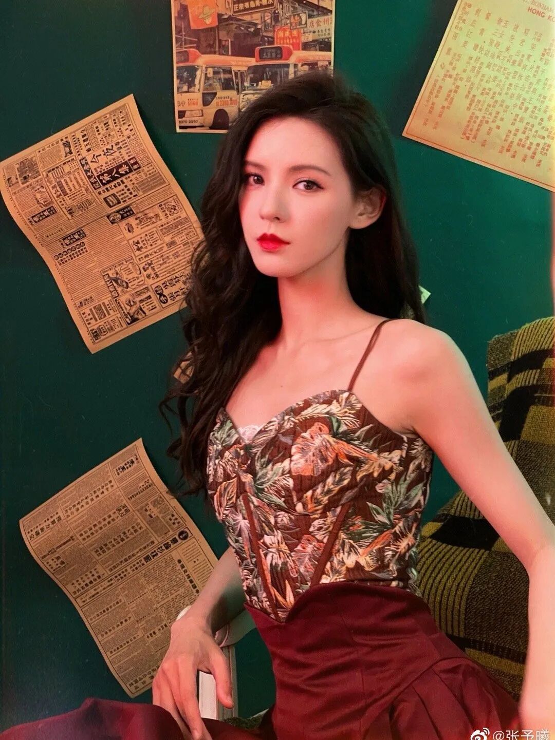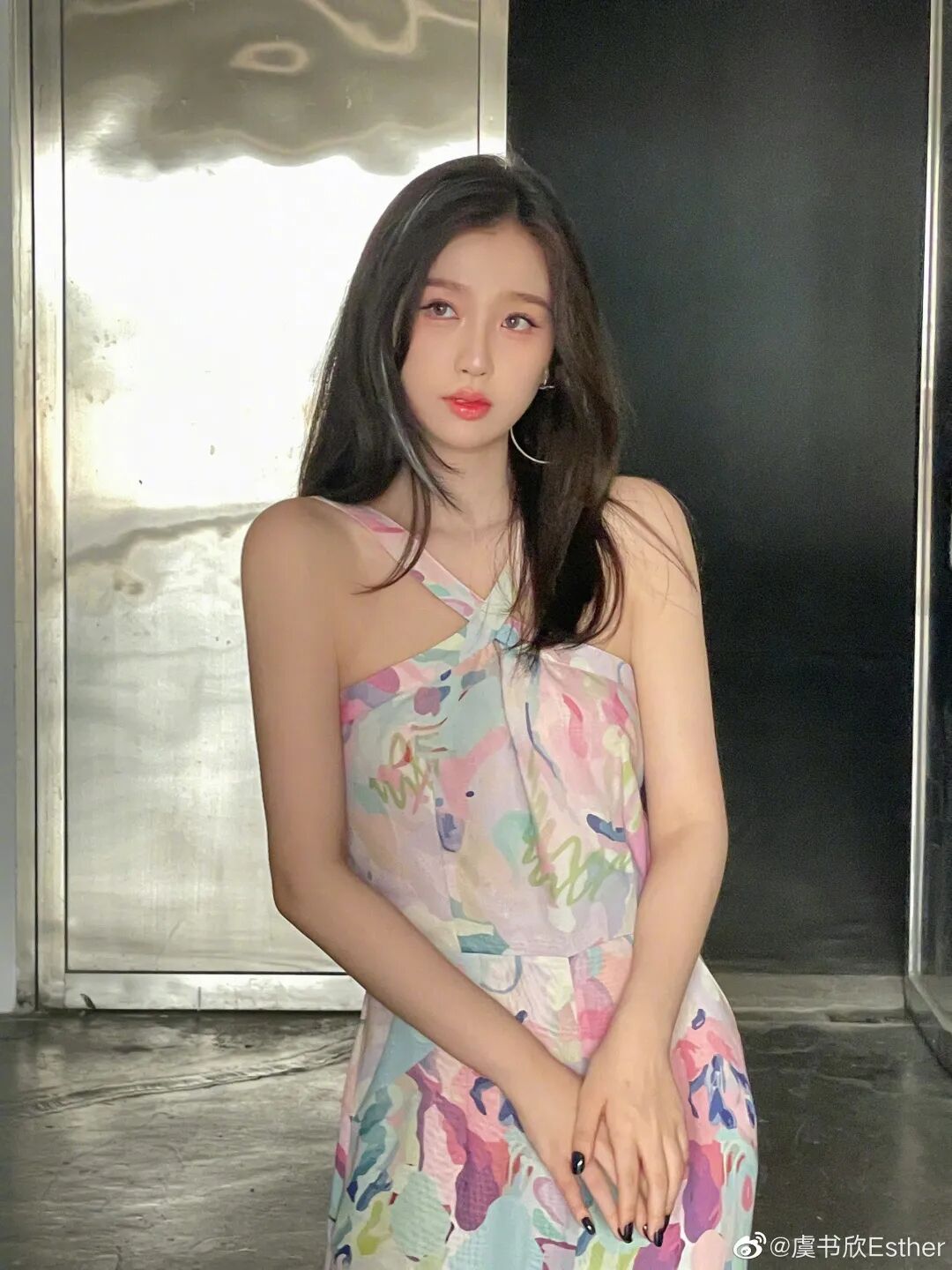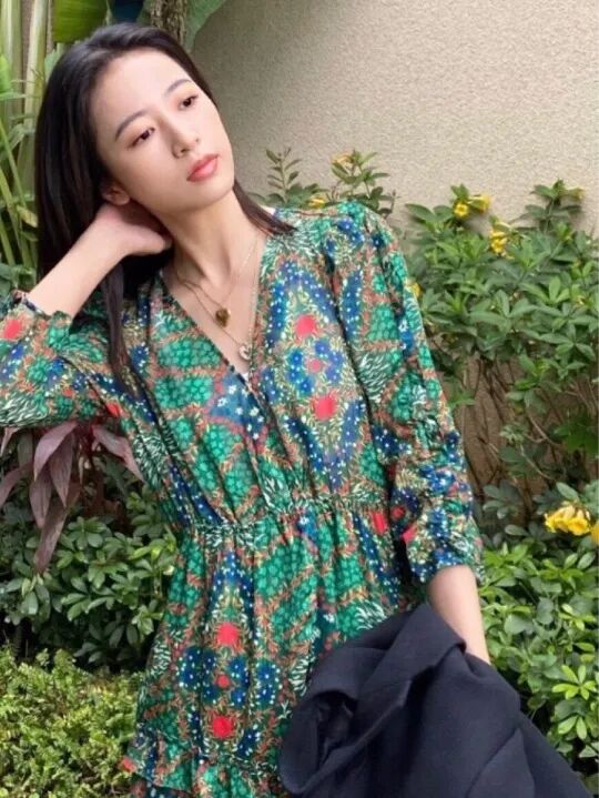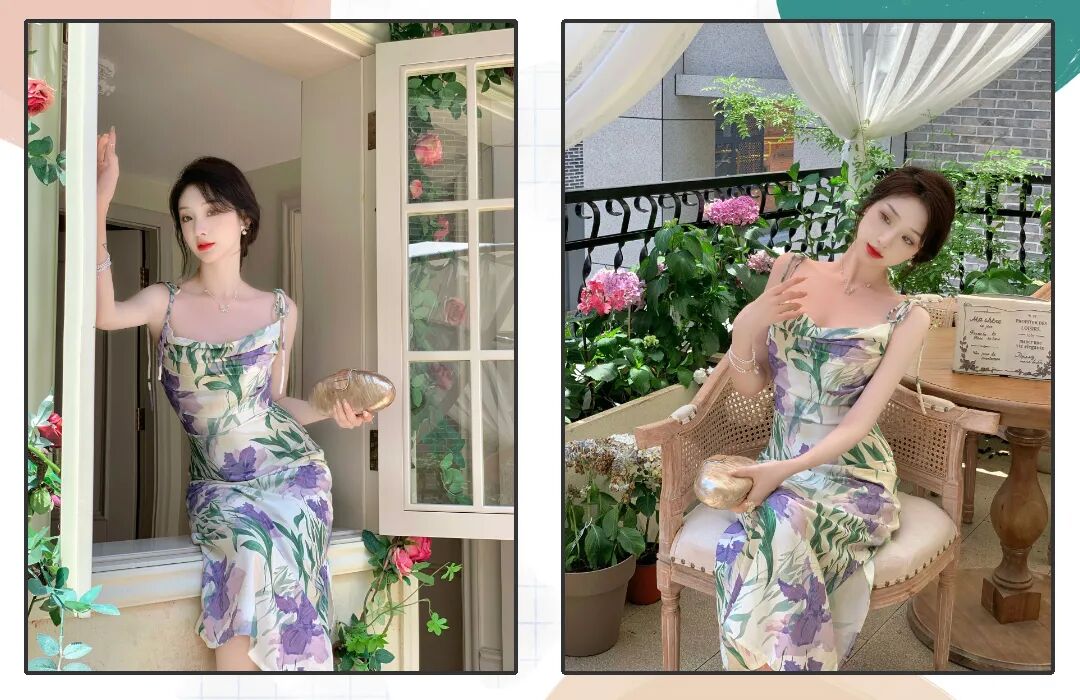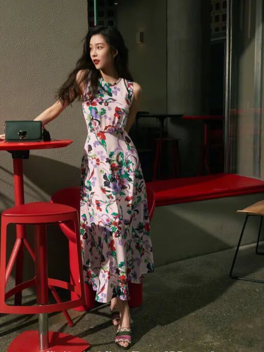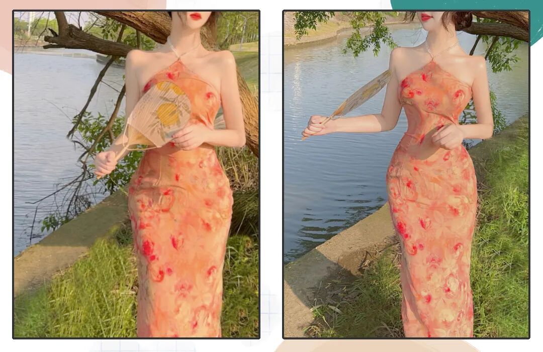 莫奈花园是改良旗袍的款式,高露肤度和高饱和度结合立刻有了明艳大美人的模样。