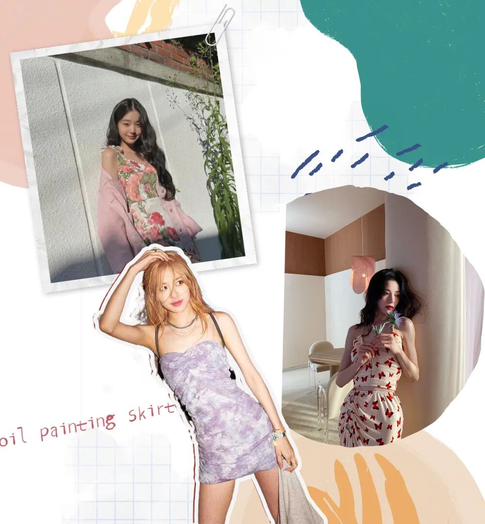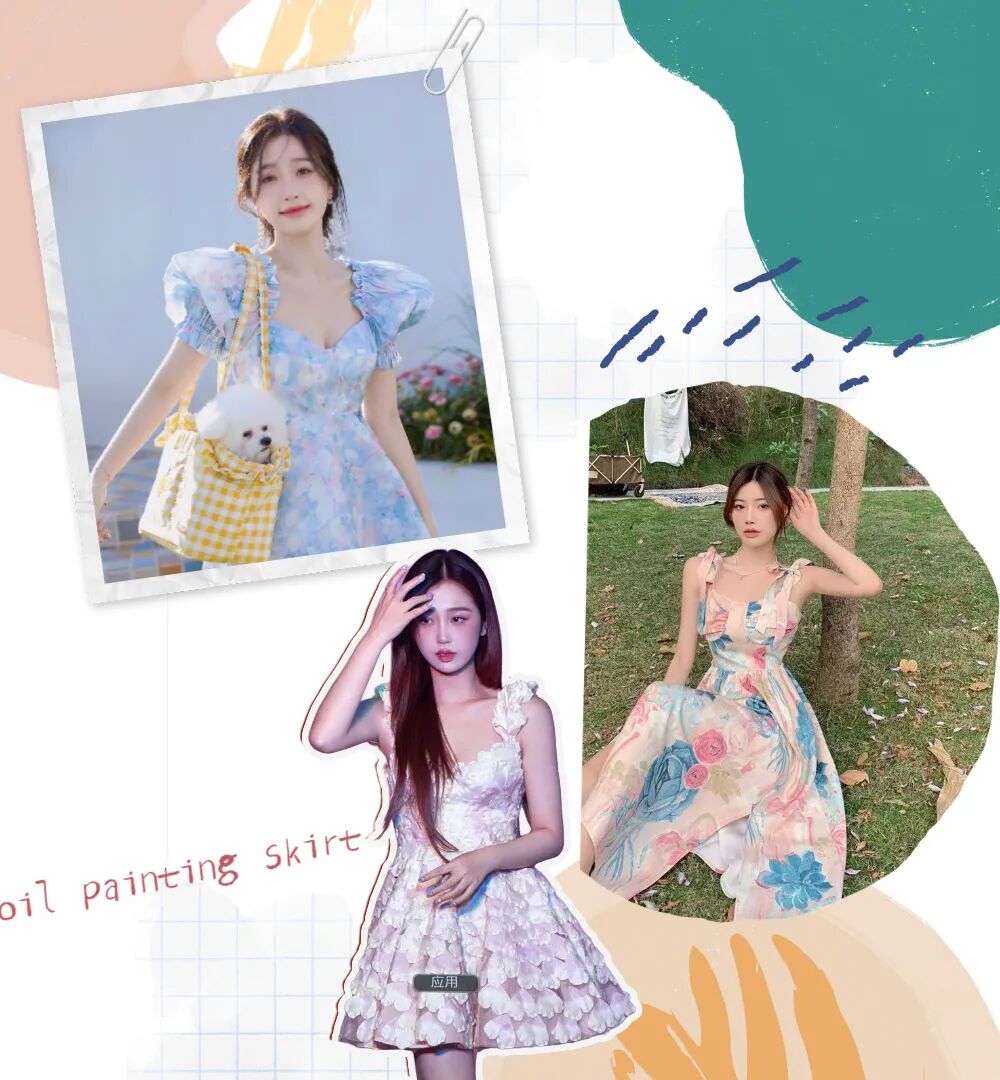 油画裙因为色彩比较浓郁、留白较少一不小心就会穿的土气,所以底色尽量选浅色更有甜美清新的感觉。