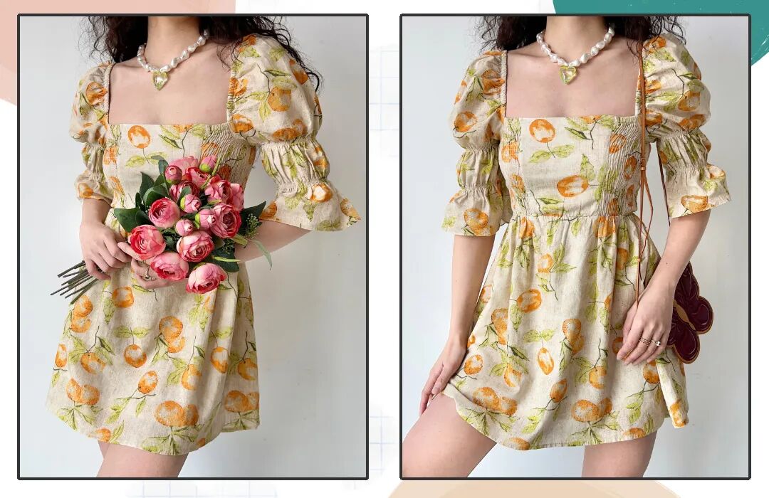 做旧的水果印花就像是中世纪的一副油画,泡泡袖的设计和藏肉剪裁让它对身材的包容度更高👇