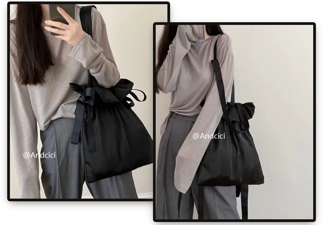 黑色绸缎束口包袋很有暗黑萝莉的感觉,甜酷style~