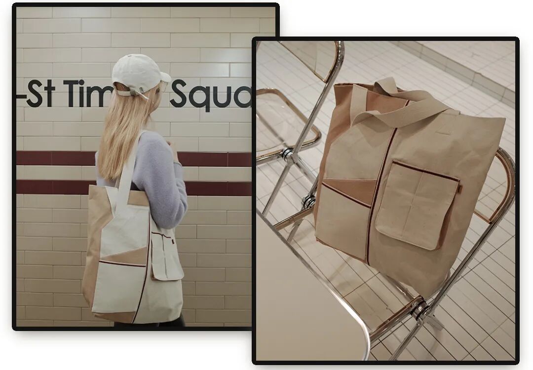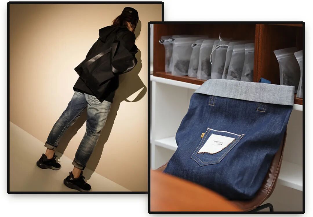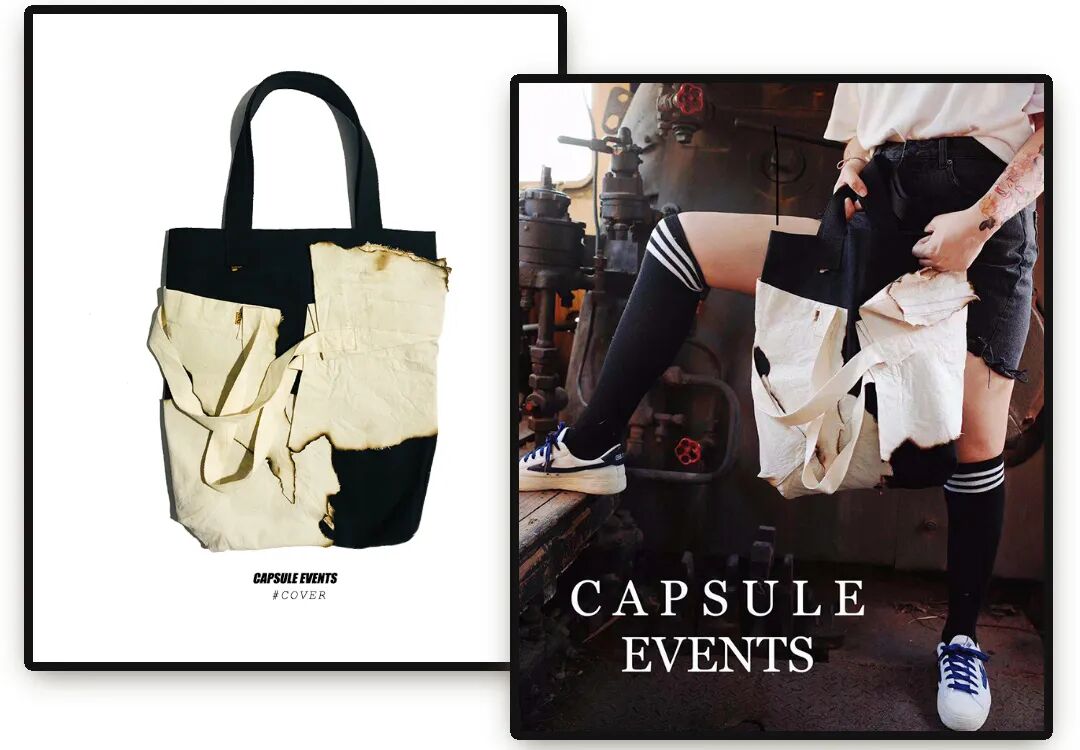通过对帆布的解构重构而重新拼接起来的包包体现了不愿从众的生活态度。
