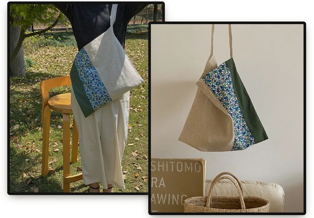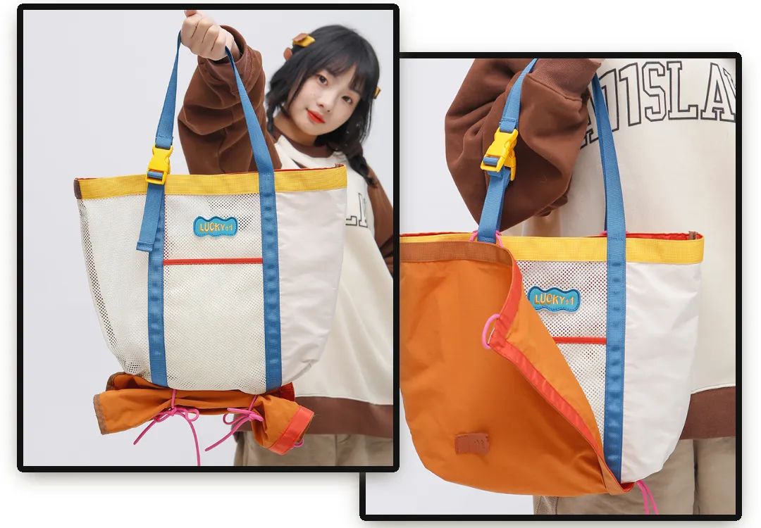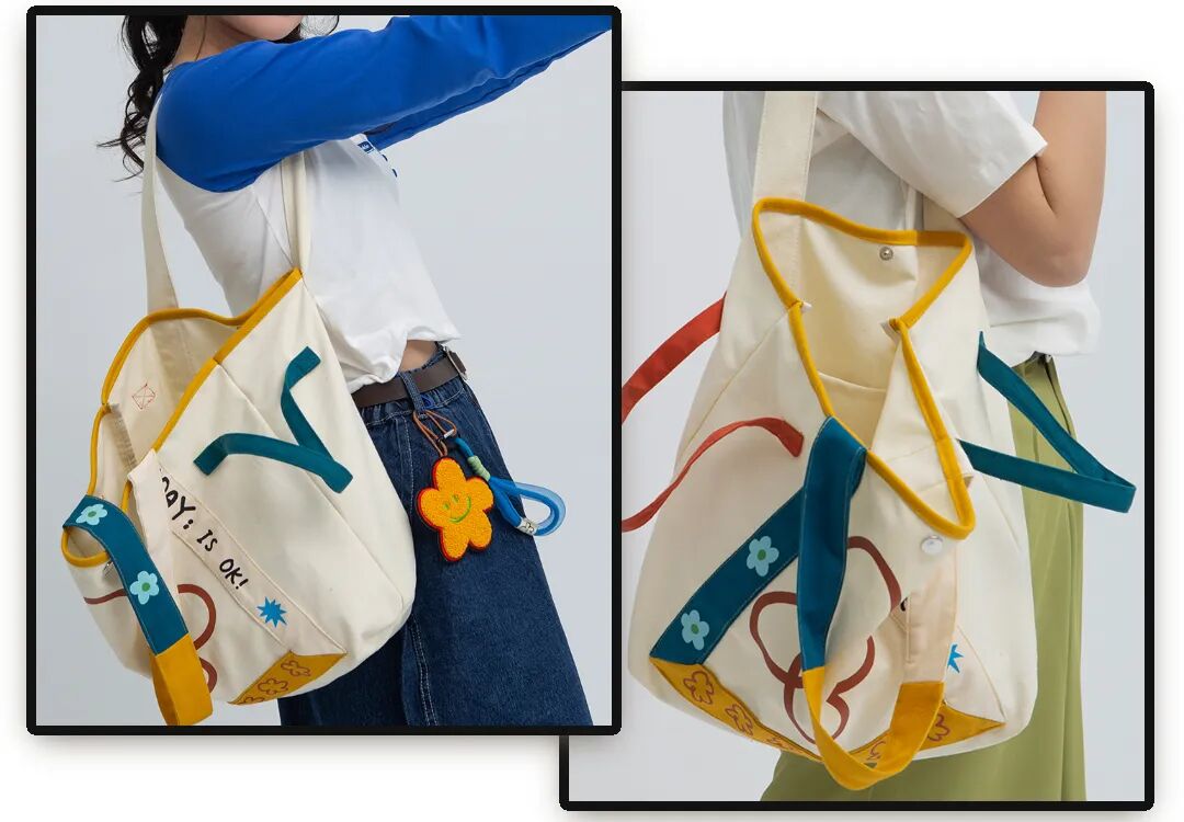 撞色拼接的帆布袋趣味十足,鲜艳丰富的配色让包包元气十足。